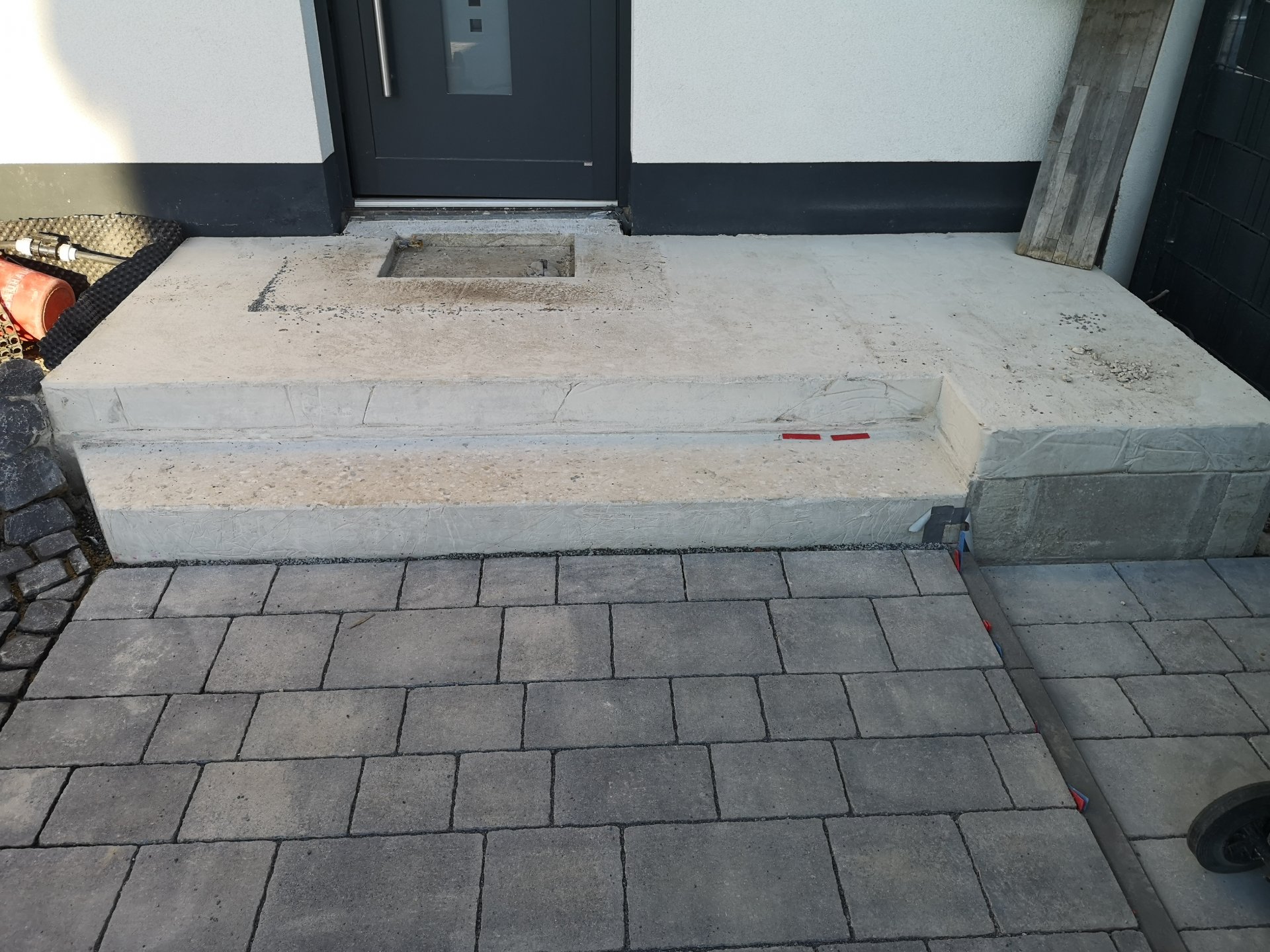 Haustür Eingangspodest Eingangsstufe fliesen: Guten Morgen, ich möchte gerne die Eingangsstufe (ca. 100 x 120 cm) mit Fliesen belegen und eine Fußmatte einlassen. Die Stufe ist aus Beton... -