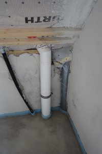 An der Nordwand unseres Schlafzimmers führen das Abgasrohr der Heizung, ein Entlüftungsrohr und ein Leerrohr für die PV-Anlage entlang. Der Verputzer hatte damals Schwierigkeiten, das ordentlich dicht zu kriegen, und auch die Trockenbauer hatten ihre Probleme, wie man auf dem Foto sehen kann.