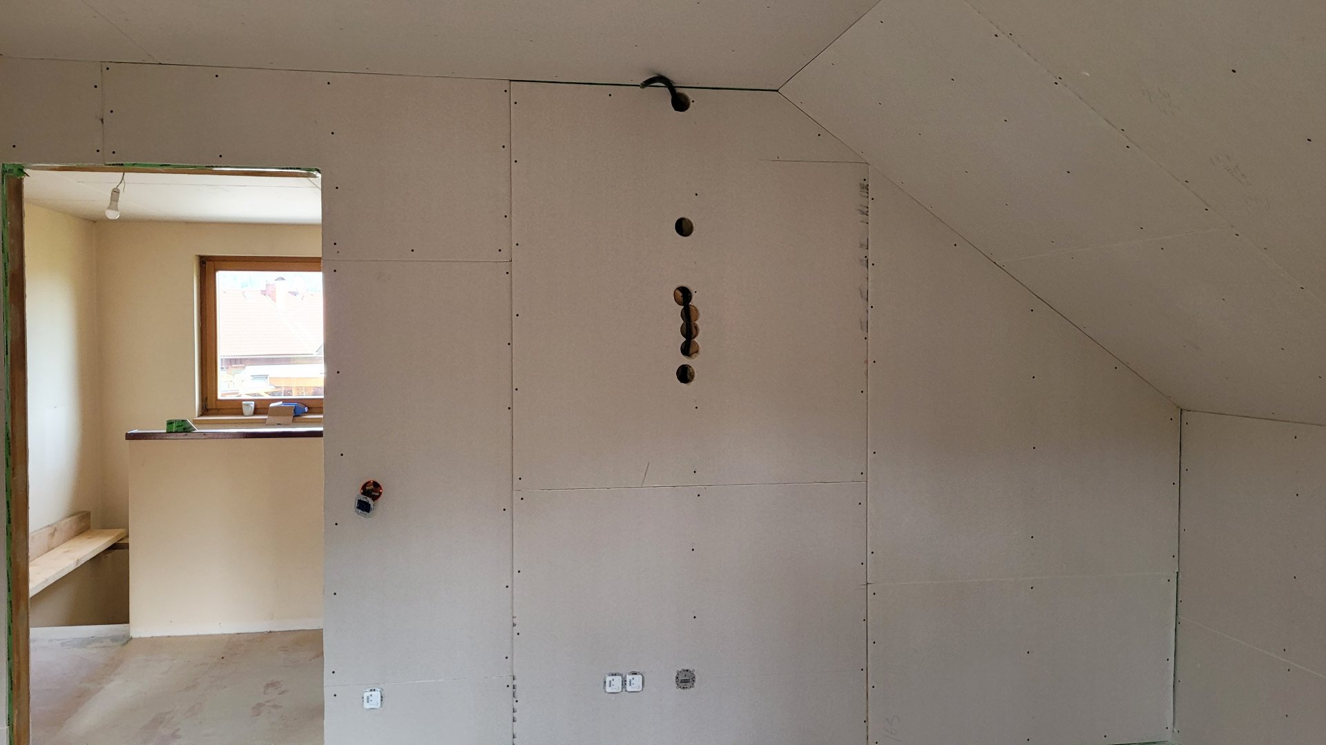 Der Vollständigkeit halber: Wir haben bei der Renovierung nur die Wände neu gemacht, bei denen wir die Holzvertäfelung entfernt haben und darunter dann eine sehr löchrige Dampfbremse zum Vorschein kam. Es wurde auch an einigen Stellen die Dämmung erneuert und eine komplett neue Dampfbremse und OSB Platten + Rigips verschraubt. An der Wand im rechten Zimmer, haben die Elektriker das LAN Kabel eh über den Schrägbanken geführt, da dank OSB Platte genug Spielraum war.