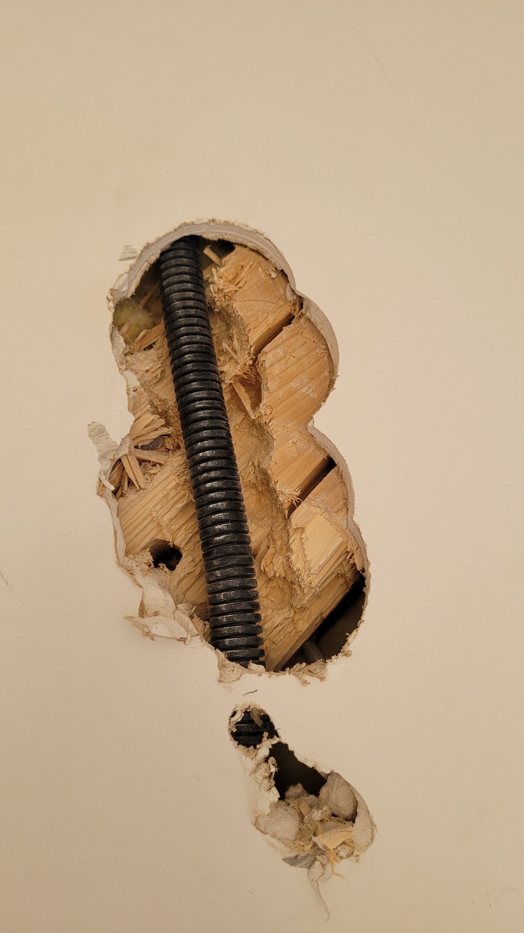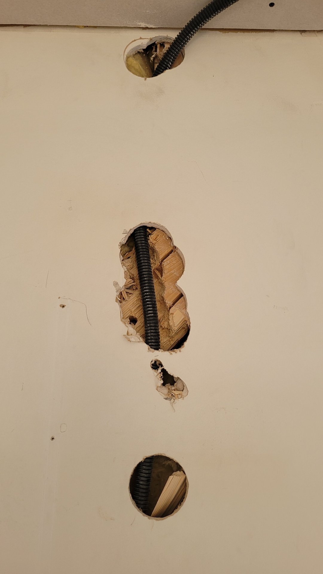 5. Elektriker hat Holzbalken mehrfach durchbohrt