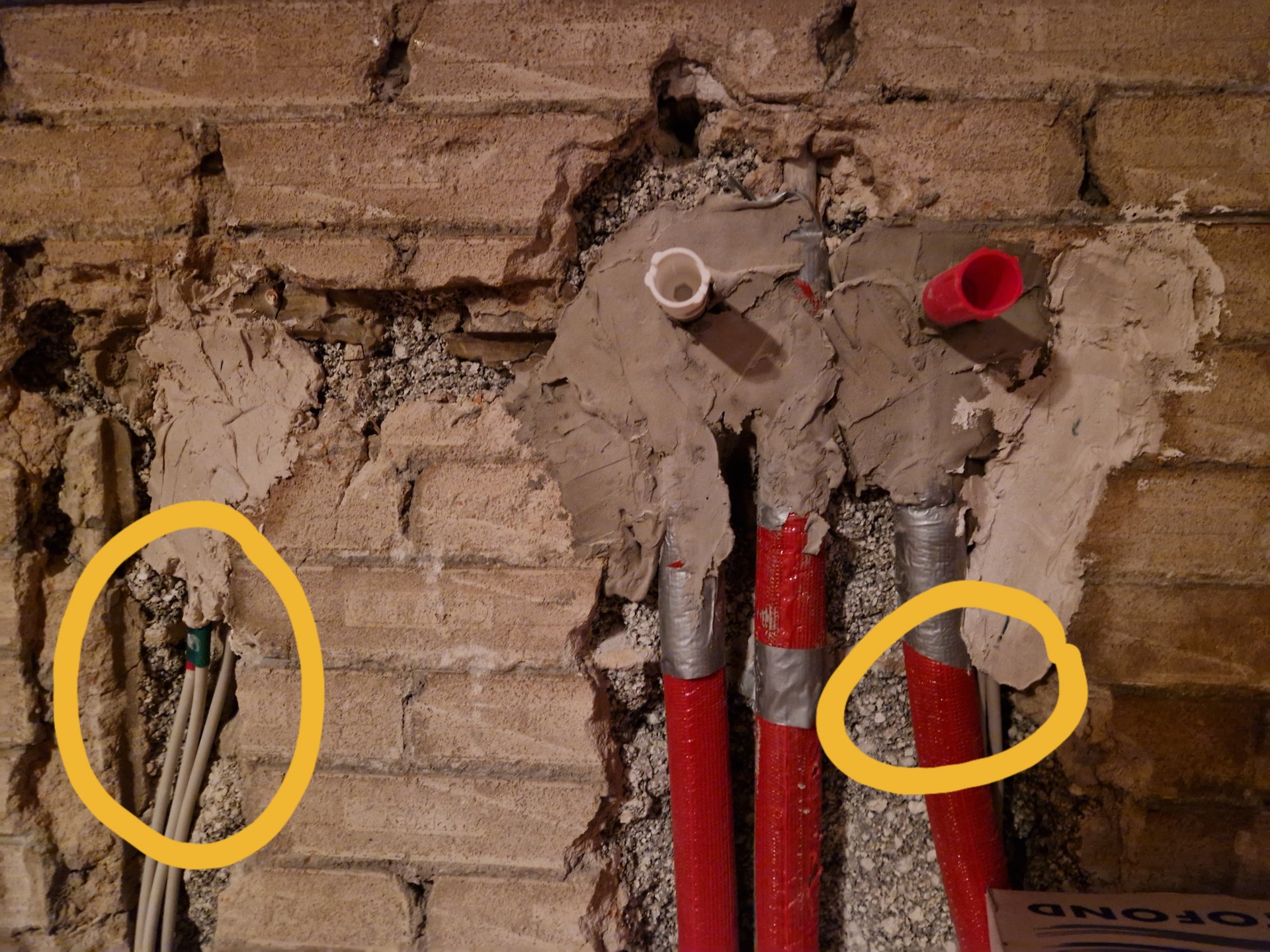 Der vom Vermieter beauftragte Elektriker hat das Problem jetzt wie auf dem Foto zu sehen gelöst: Die Elektroleitungen laufen nun direkt neben den teilweise neuen, nun isolierten Wasserleitungen nach unten bis knapp über den Boden, ein Stück weiter wieder hoch und verschwinden in der nicht weiter geöffneten Wand.