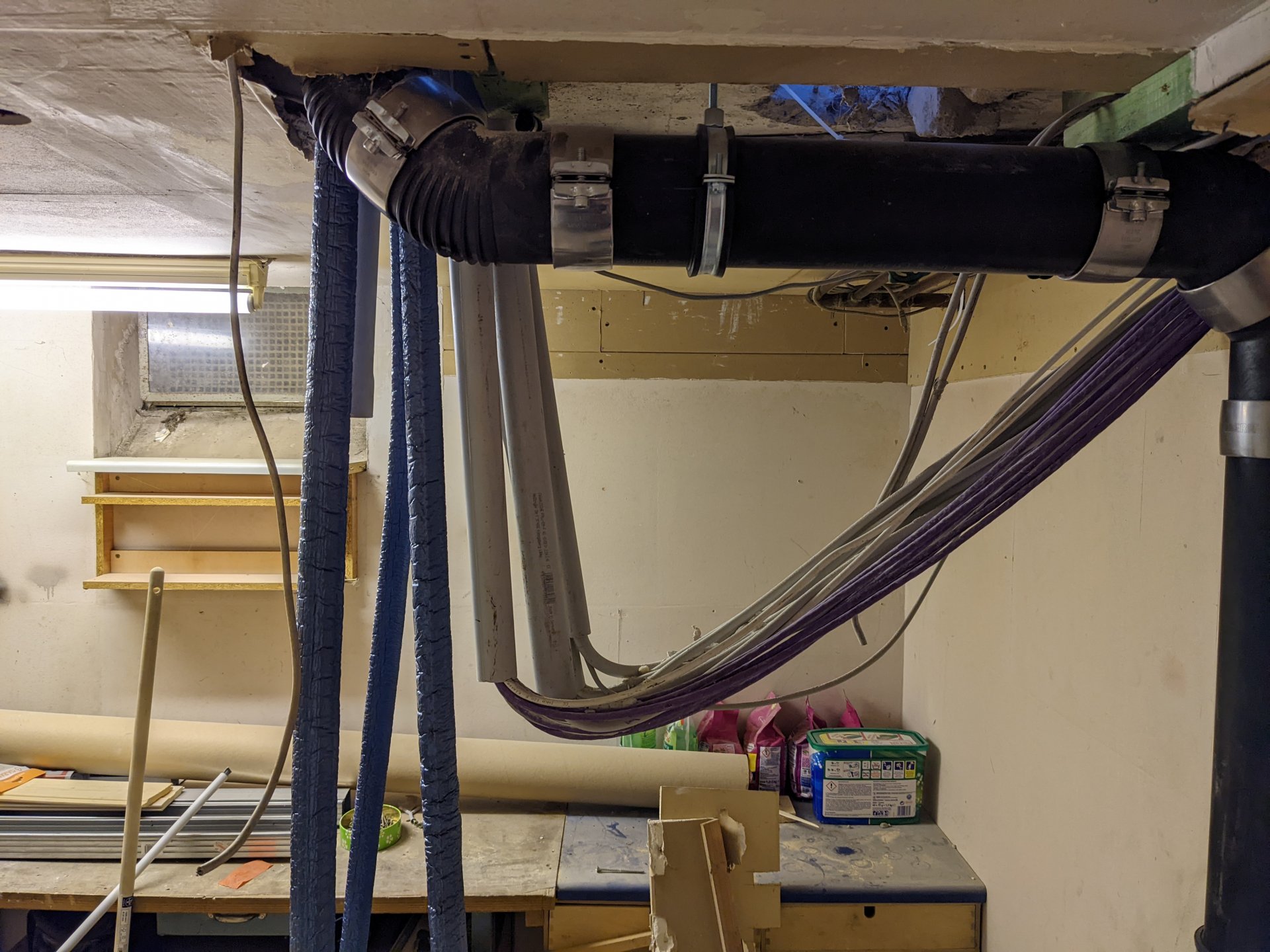 Abgas- und Wasser- bzw. Elektroleitung in einem Schacht