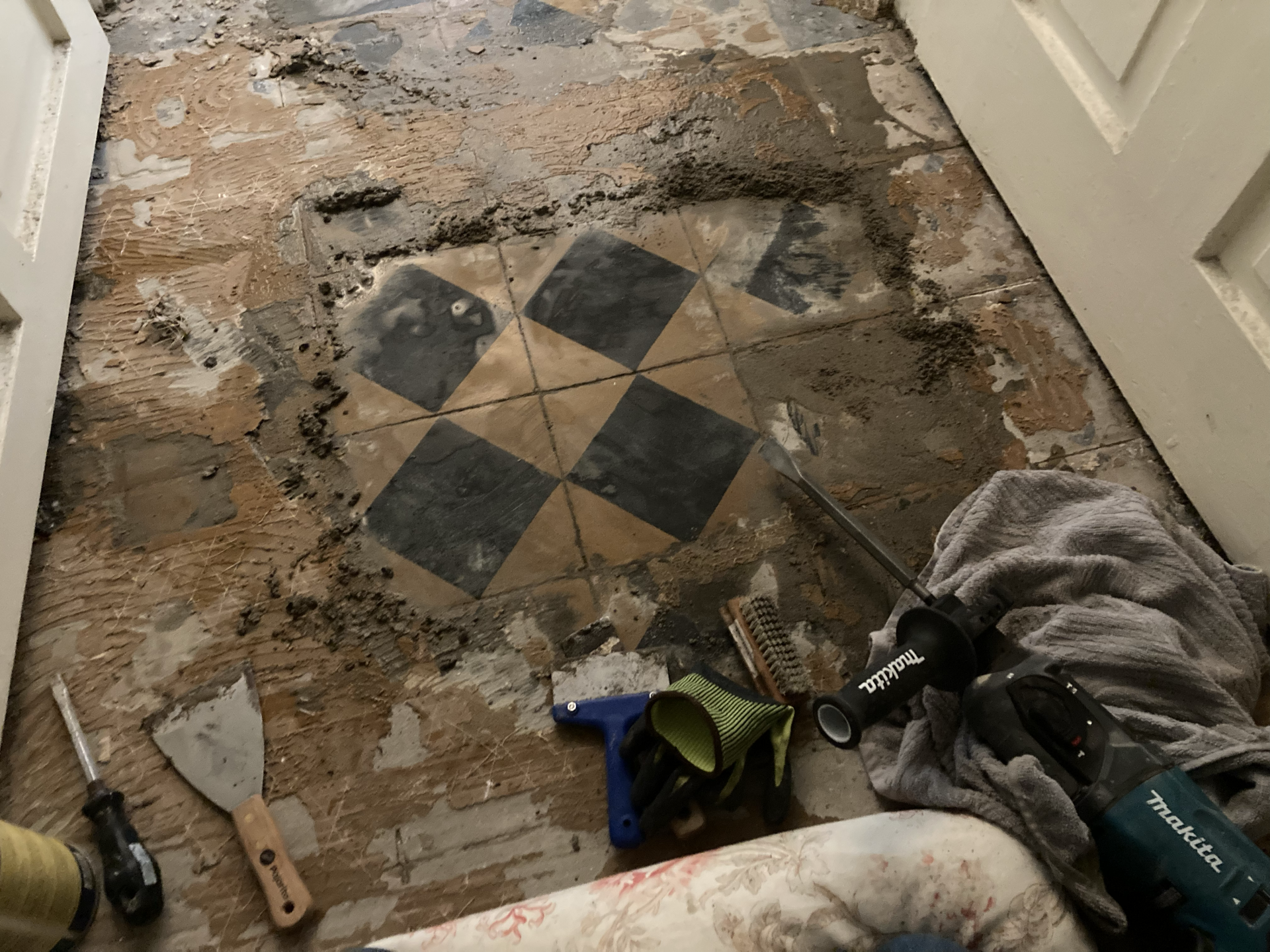 Entfernung Parkettkleber/Zementmörtel von historischen Zementfliesen