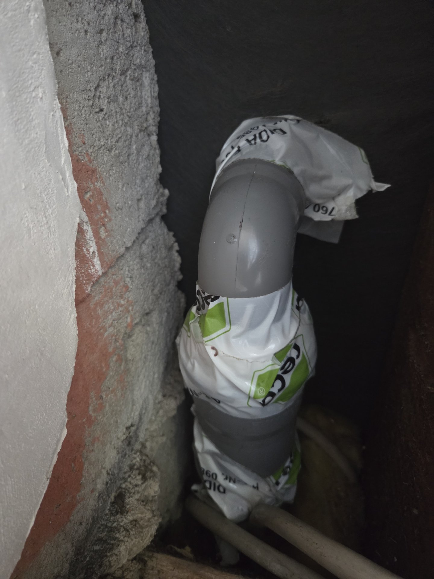 Kann es vielleicht sein, dass der Dachdecker keine Dichtungen in den HT-Rohren montiert hat und mit dem Klebeband versucht das irgendwie dicht zu bekommen?