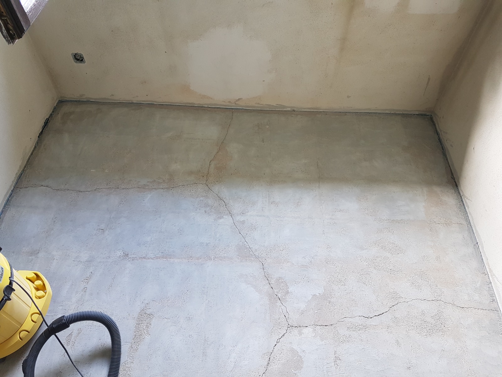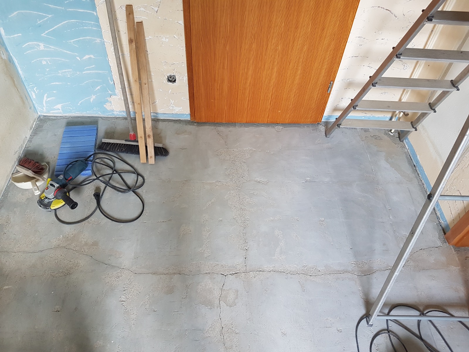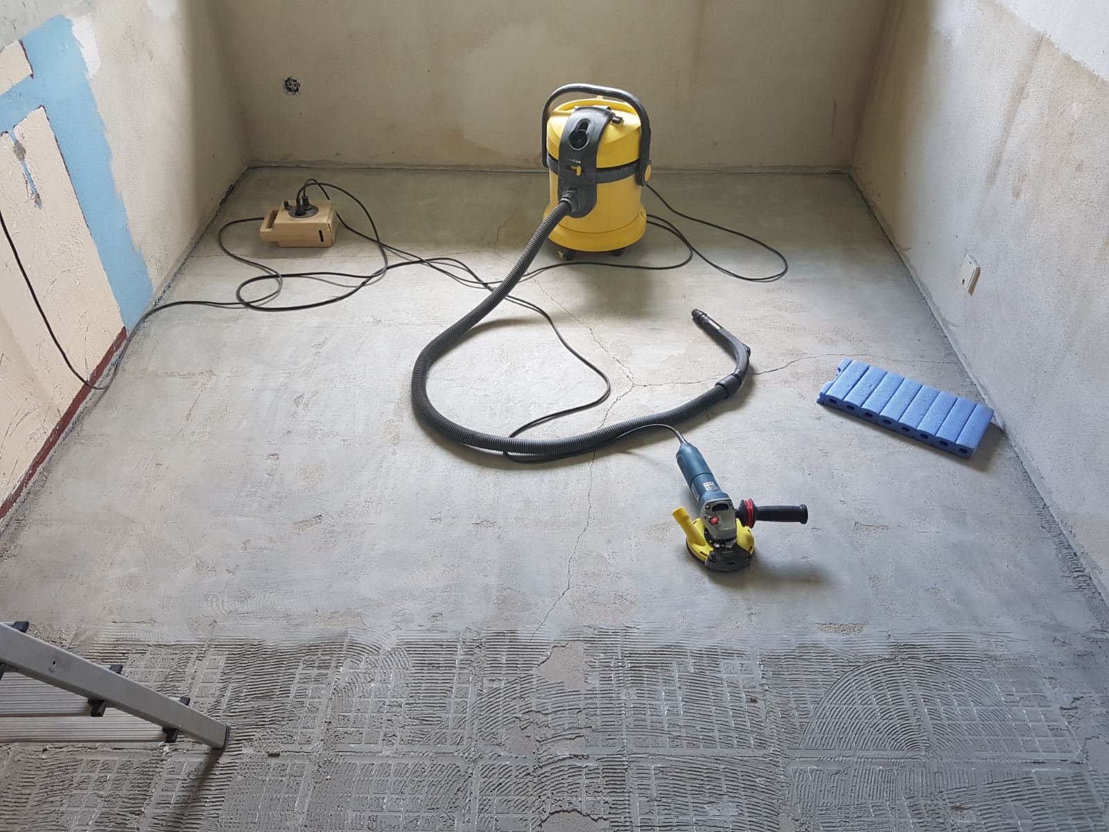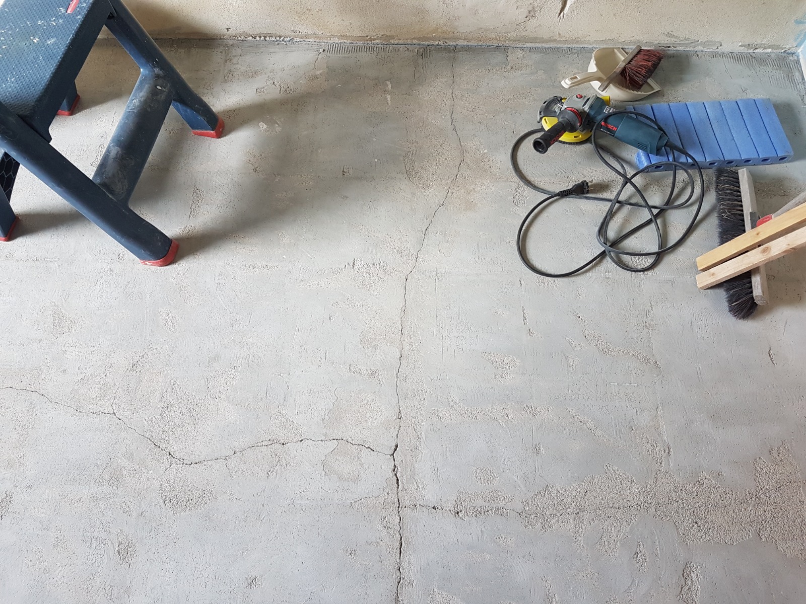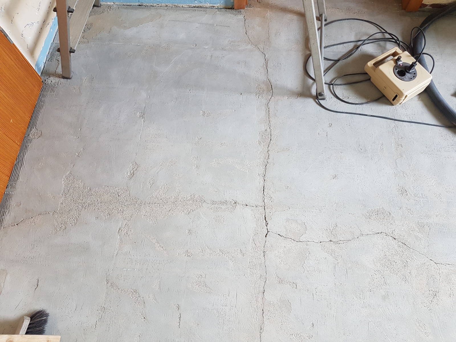 Der alte Fliesenbelag mit mehreren gerissenen Fliesen machte mich im Vorfeld schon stutzig. Nach Entfernung der Fliesen, hat mir der Estrich keine Ruhe gelassen und ich habe den kompletten Fliesenkleber abgefräst.