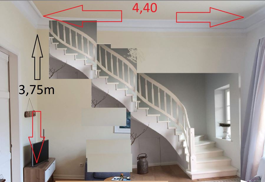 Was ev. dafür spricht, dass die Treppenbreite exakt mit dem ersten Längsbalken passt: Nach der Außenwand kommt ca. nach 1m ein Senkrechtbalken, als bei der Wandöffnung in der Etage darüber das Fachwerk freigelegt wurde. Dann könnte man sauber am Balken die 4,40m komplett öffnen. Fußboden zu Fußboden sind es 3,81m obwohl in der Zeichnung 3,75m Höhe ohne Decke stehen. Die Decke ist 34cm dick. Hab im Hausflur gemessen.