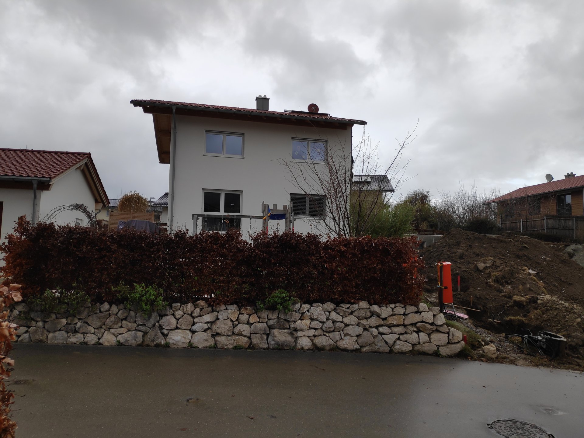 Bitte teilt mir eure ehrliche Meinung zur beiliegenden Südansicht mit. Beim linken Objekt handelt es sich um 5 Jahre alten Bestandbau in Massivbauweise, das rechte Objekt wird aktuell von einer Fertighaus Firma errichtet und nachträglich geplant.