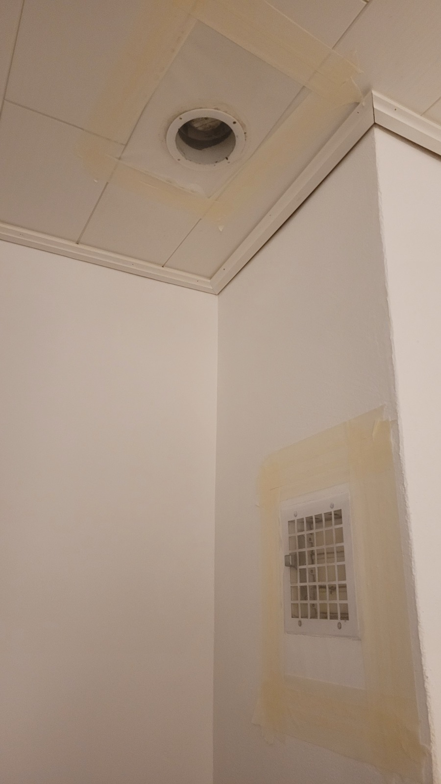 Im Obergeschoss-Bad haben wir zwei Schächte. Einmal oben an der Decke, da ist auch ein Ventilator drin, der mit einem Schalter angeschaltet werden kann und an der Seite noch dieser viereckige Schacht - wohl ein Relikt aus alten Tagen.