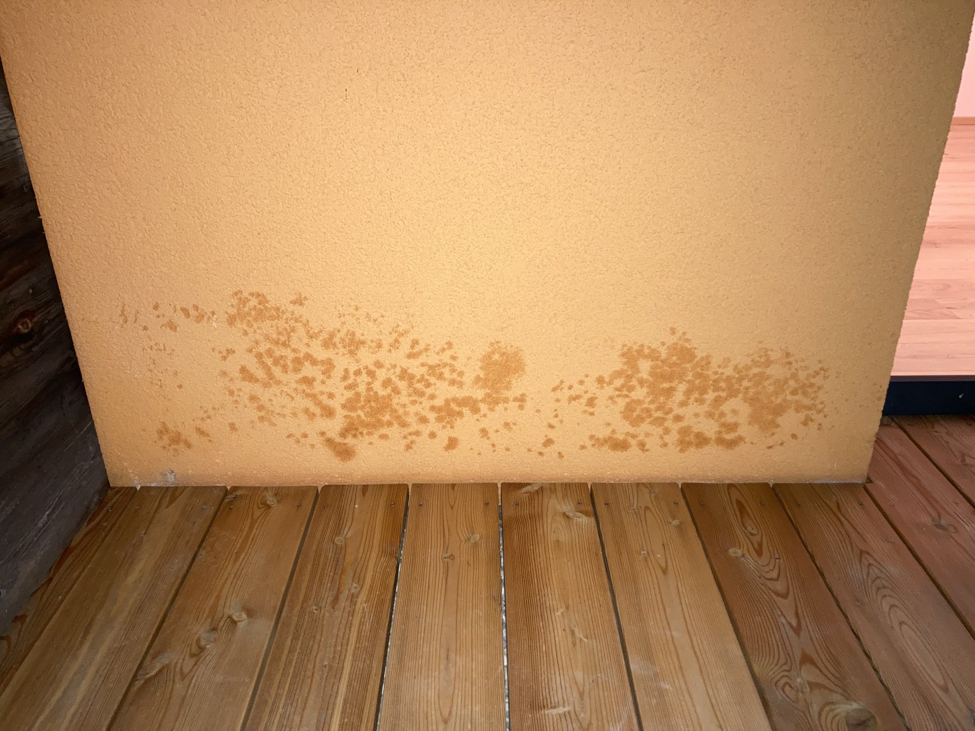 Feuchte regelmäßige Flecken Fassade Spritzschutz: Guten Tag, bei meiner Hausfassade sind am Spritzschutz in regelmäßigen Abständen Flecken. Es sieht aus wie feuchte Stellen mit Farbabgang. Noch... -