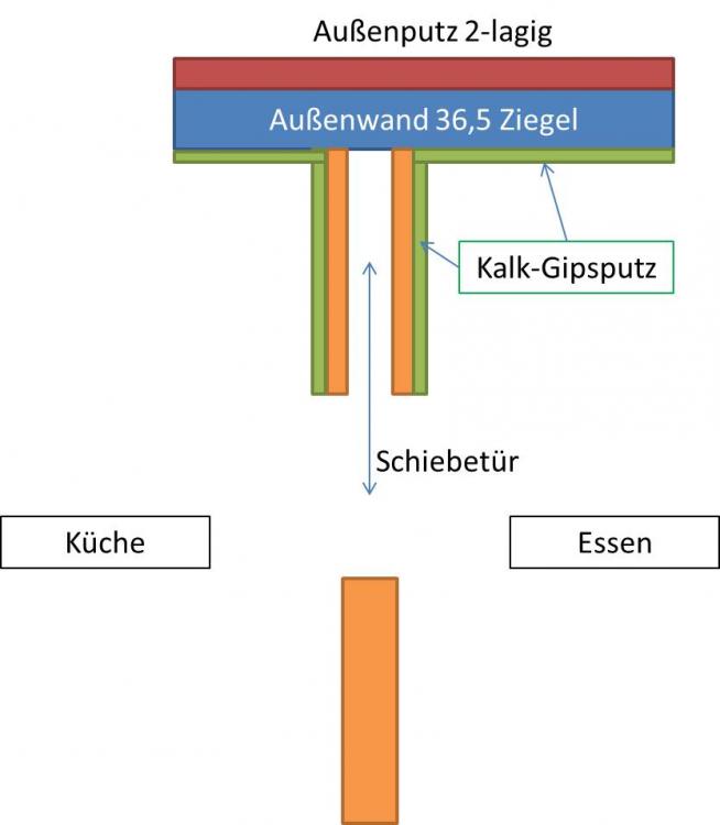 Diskutiere Fehlender Innenputz an Außenwand im Mauerwerk Forum im Bereich Neubau; Hallo zusammen, folgende Situation (siehe auch Bild): Zwischen Küche und Essen befindet sich eine Schiebetür. Die beiden Mauern, zwischen denen...