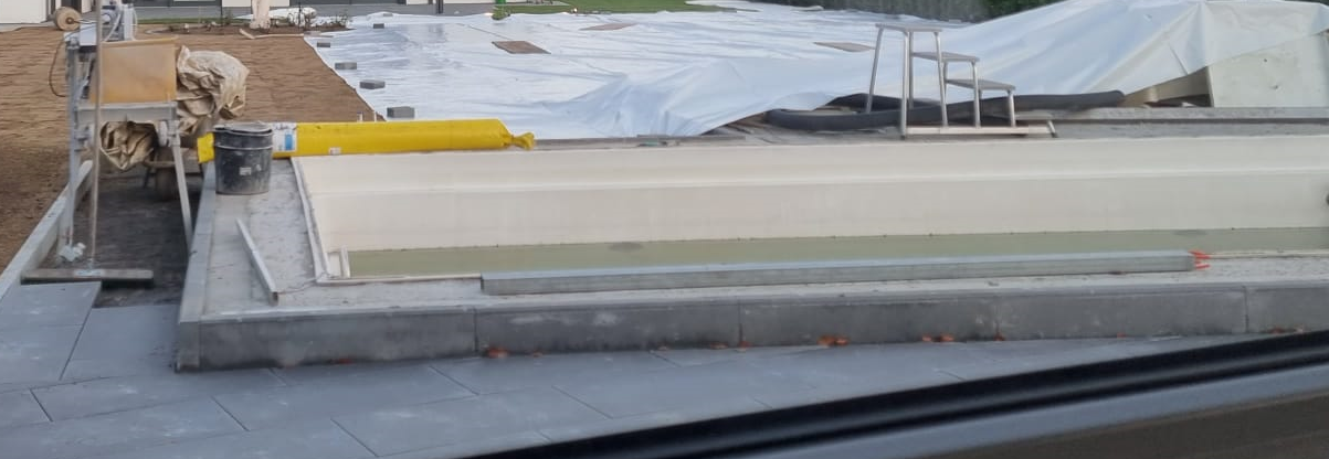 wir haben auf dem Grundstück noch einen alten Pool, ein PVC Becken mit 50m², das ringsrum in einer Betonwanne sitzt. Die Betonwanne steht teilweise über die neue Geländekante (neues Haus, Bestandspool mit Technikkeller) raus. Um die Betonwanne wurden Randsteine gesetzt, die Oberkante ist genauso hoch wie das Becken (siehe Foto).