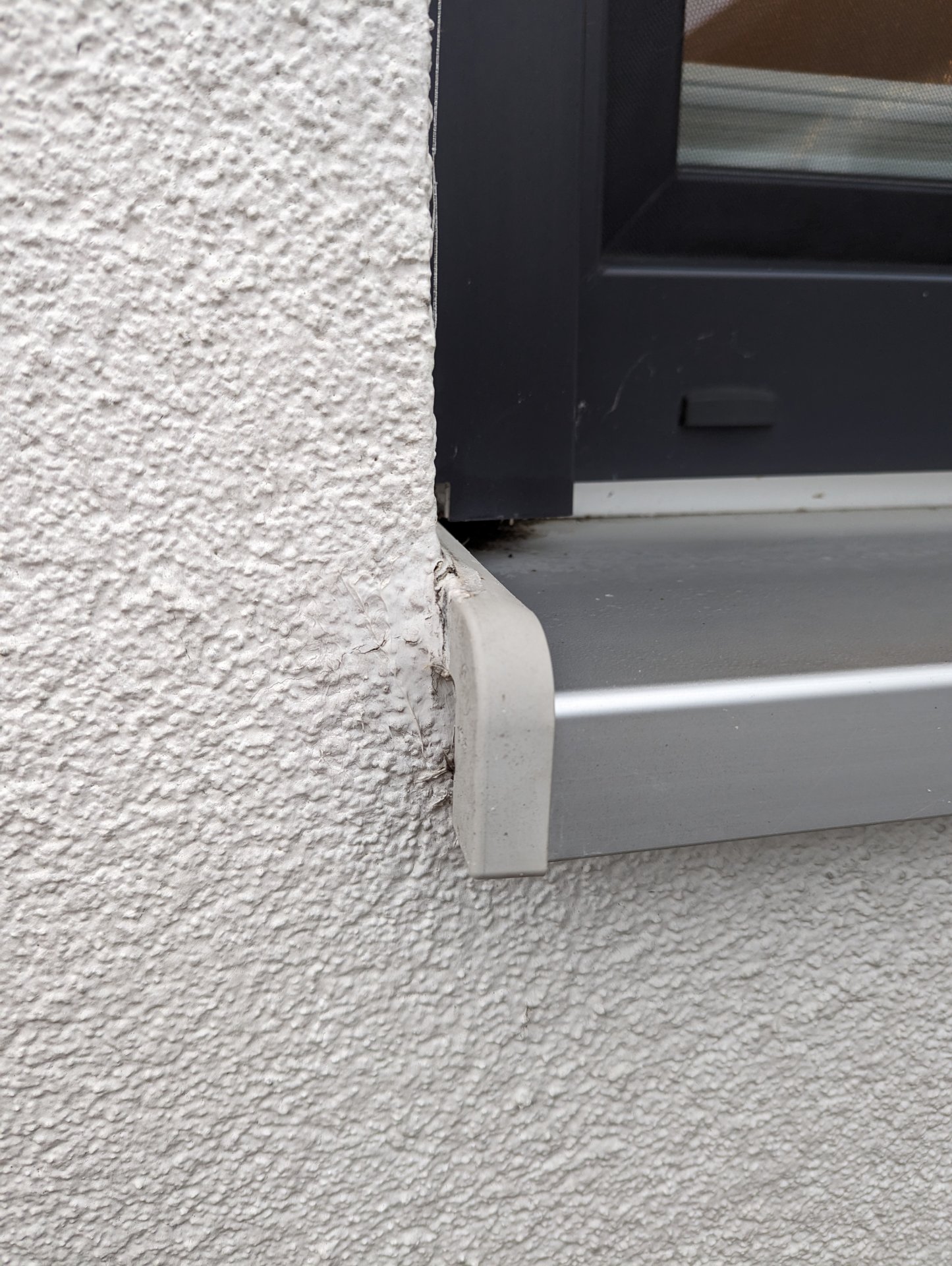 Bei Begutachtung hat uns ein Gutachter bereits drauf hingewiesen, dass die Fensterbänke unsachgemäß eingebaut sind. (siehe Bilder) Das Eindringen von Wasser (Regen oder Feuchtigkeit an der Fassade) ließe sich aber leicht durch regelmäßige Abdichtung mit Silikon verhindern. Gesagt, getan. Verwendet habe ich Sikaflex-521 UV - Leider nach einem Jahr erneut die Risse und mittlerweile entstehen die ersten 'Putzblasen' um die Endstücke der Fensterbänke.
