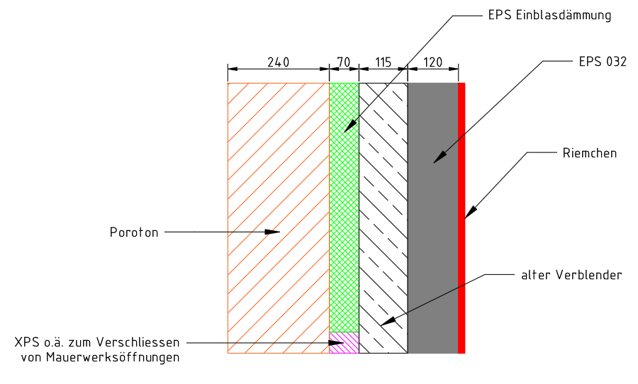 - Fassadendämmung: EPS-Einblasdämmung + EPS-Außendämmung