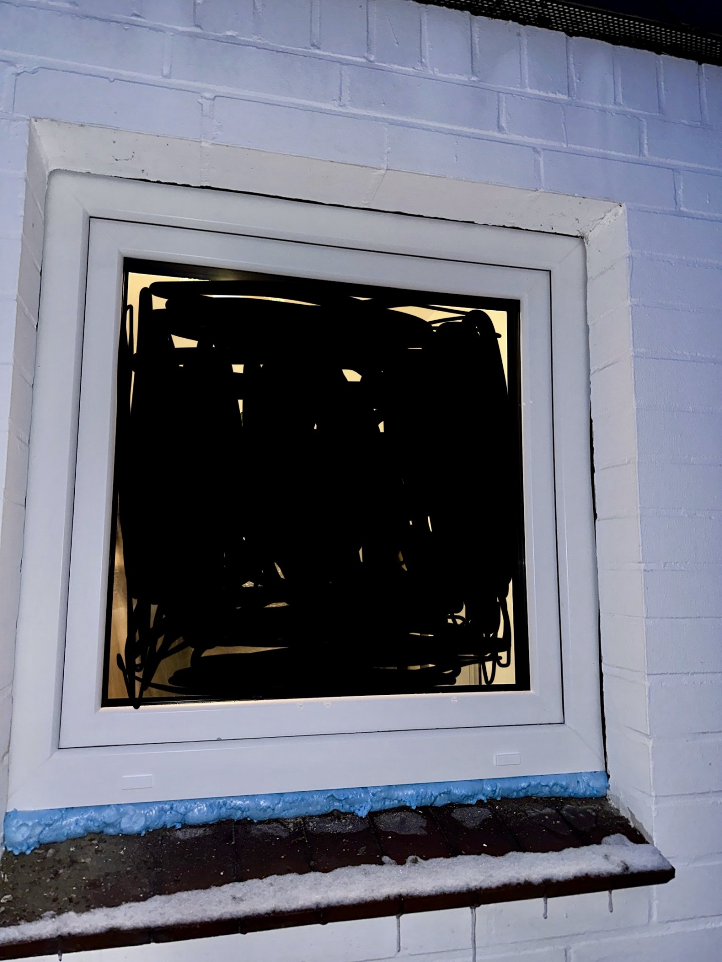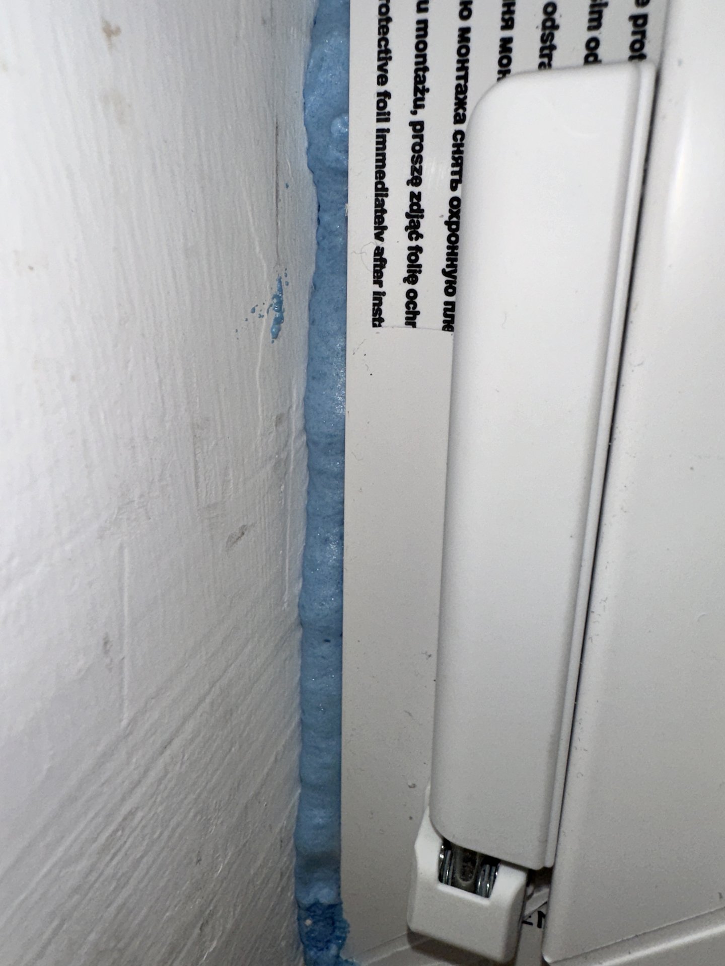 Bei einem Fenster kann ich so blauen Schaum zwischen Rahmen und Fassade sehen. Den Schaum kann man eindrücken, aber sonst passiert nichts. Also es ist fest und es zerbröselt nicht.