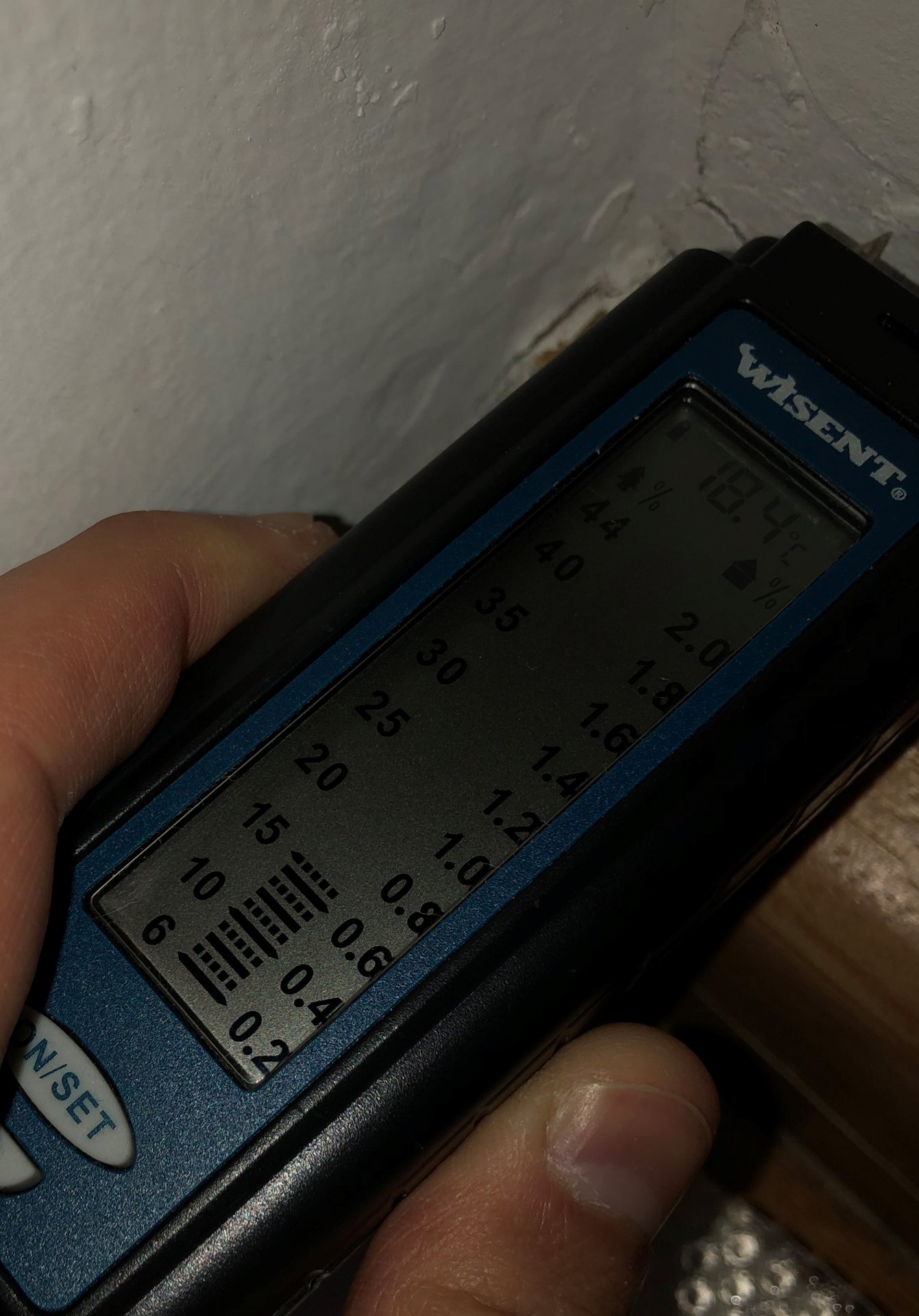 Interessant ist auch, dass ich mit dem Messgerät an zwei Stellen die Wand leicht eindrücken konnte, als wäre dort ein Stück/Fetzen von einer Tapete dahinter.
