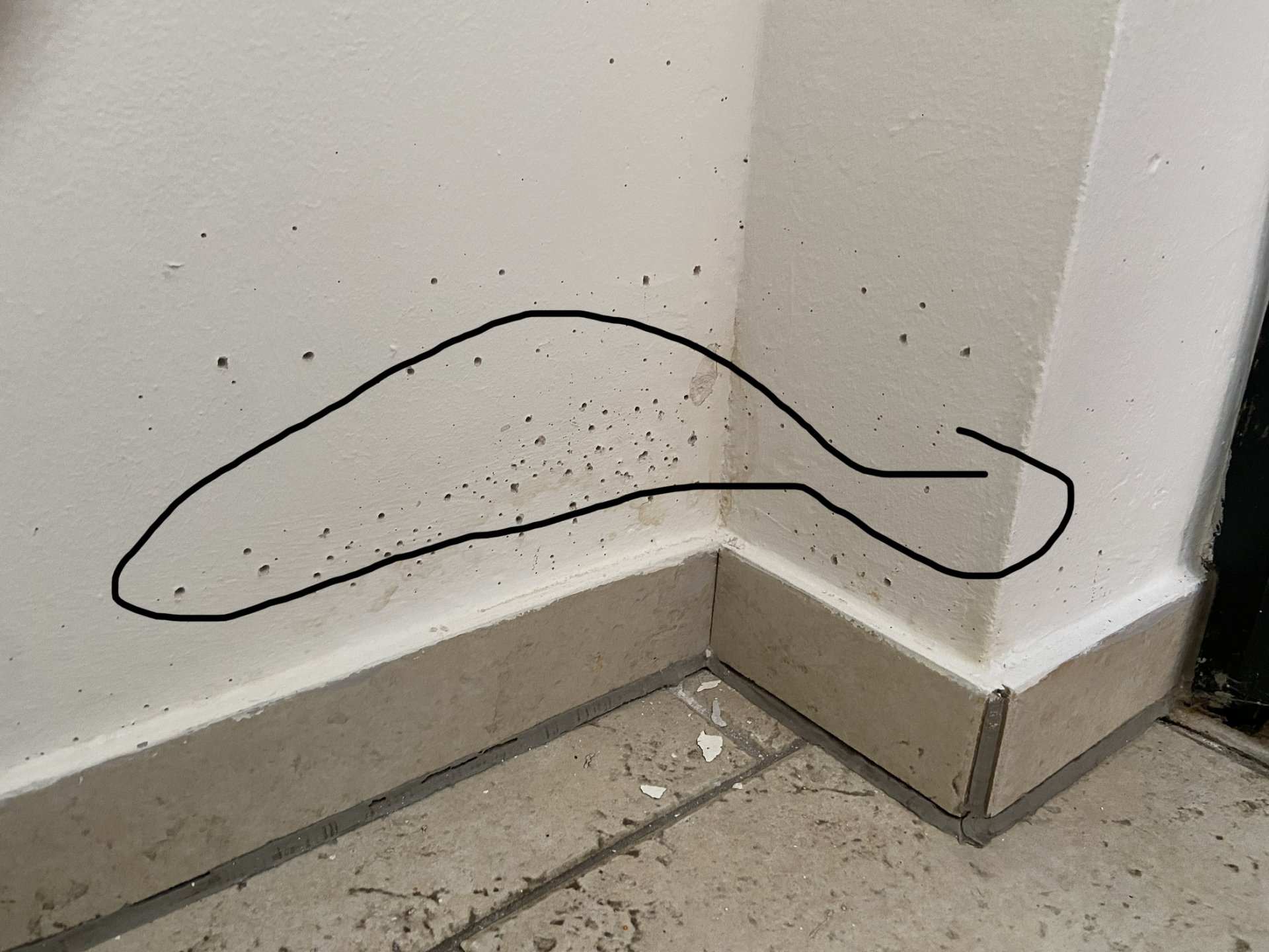 Richtig, eine Innenwand. Auf der anderen Seite im anderen Raum ist aber nichts zu sehen bzw. Feuchtes zu messen. Leitungen verlaufen nirgendwo. Die Auffahrt ist auch ziemlich abschüssig, sollte gut vom Haus weg fließen. Echt seltsam. Tiere haben wir auch nicht (die die Wand nass machen könnten).