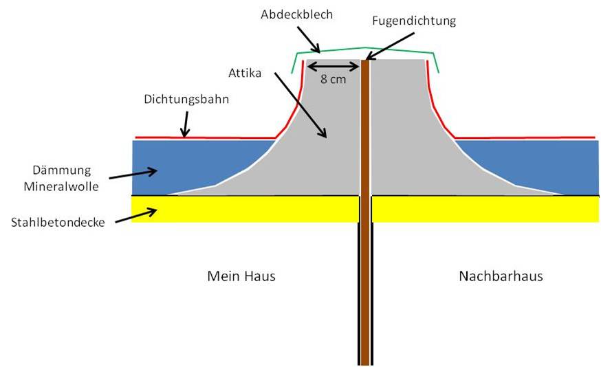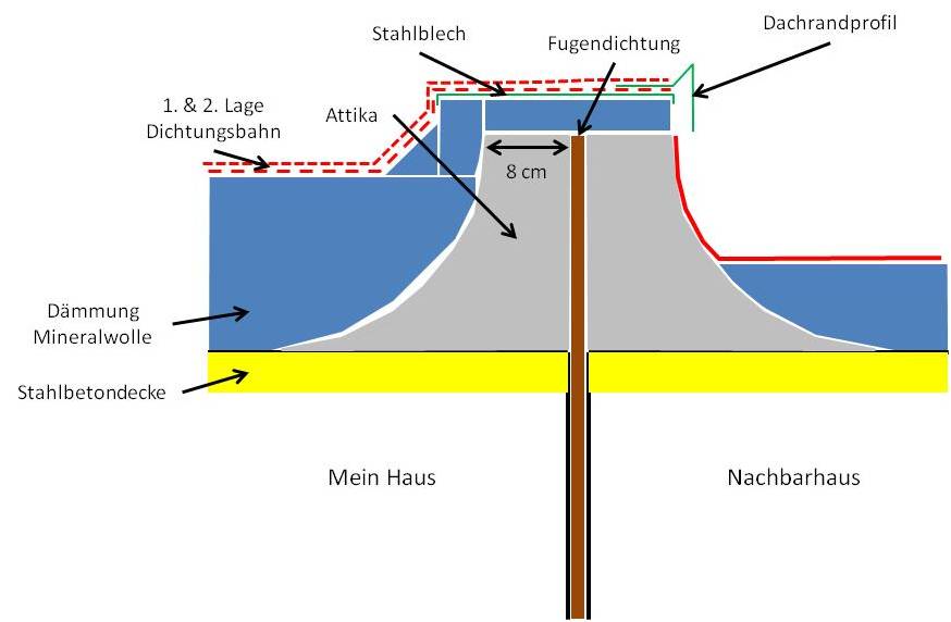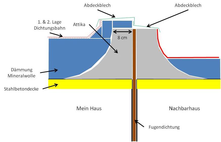 Diskutiere Flachdach-Attika zu Nachbar im Dach Forum im Bereich Neubau; Hallo in die Runde, ich brauche Dachdecker-Rat, ich hoffe, jemand kann mir weiterhelfen. Ausgangslage: wir haben ein Reihenmittelhaus mit...