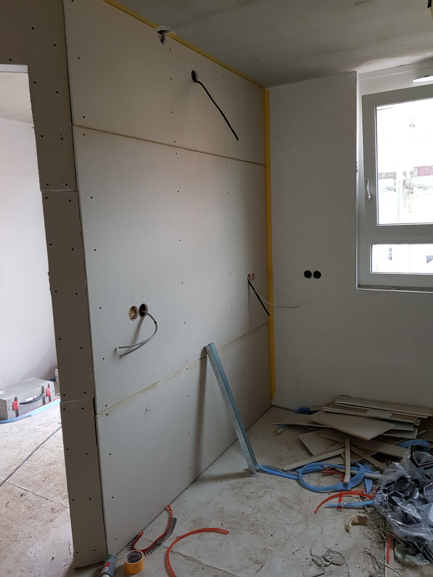 Nein Leitungen sind an dieser Stelle der Wand keine. Die Innenwand hinter der Spülmaschine ist trocken. Hier mal zwei Bilder aus dem Rohbau.