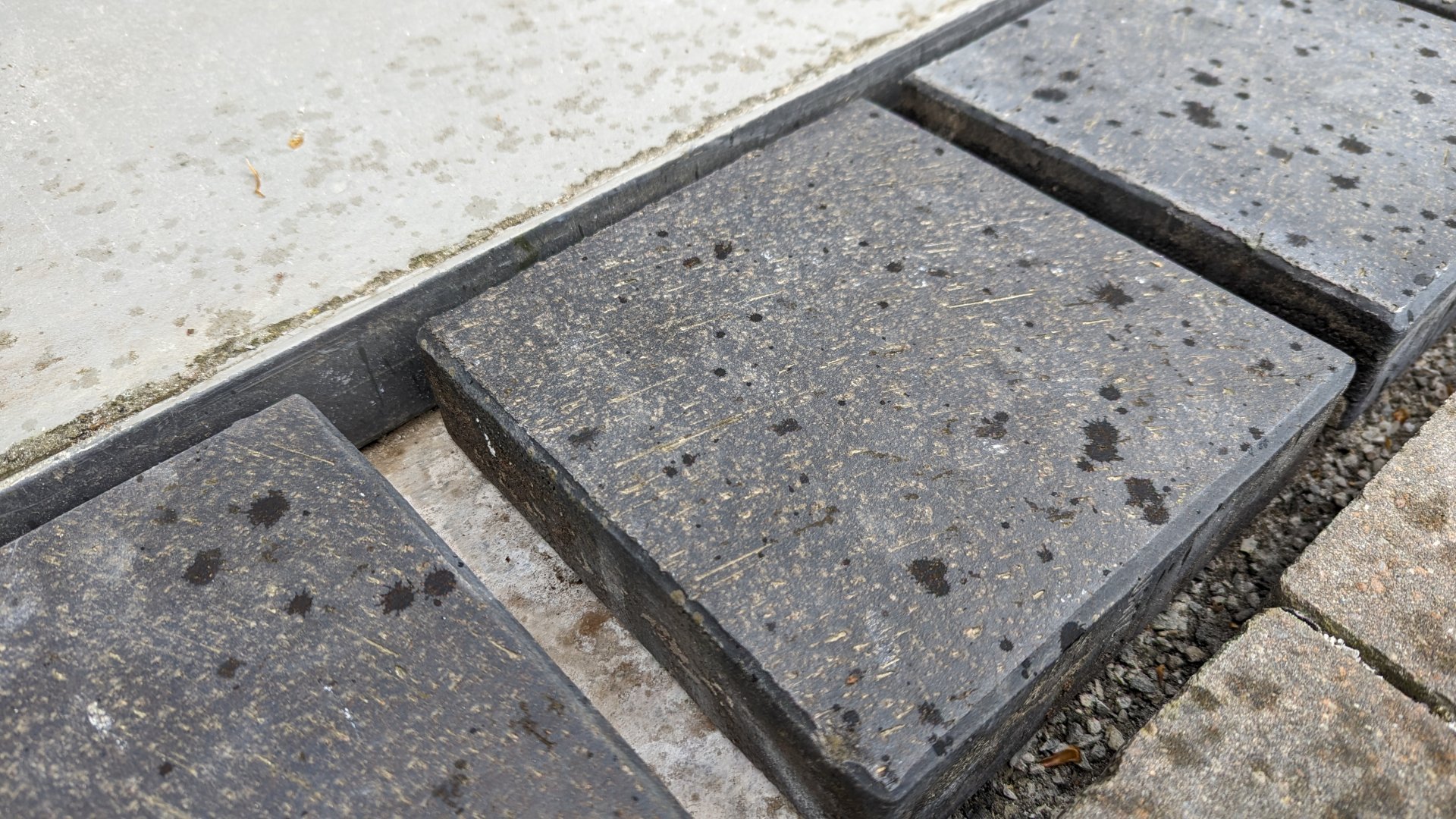 Die Steine bilden den Übergang von gepflasterter Hofeinfahrt hin zur Garage.