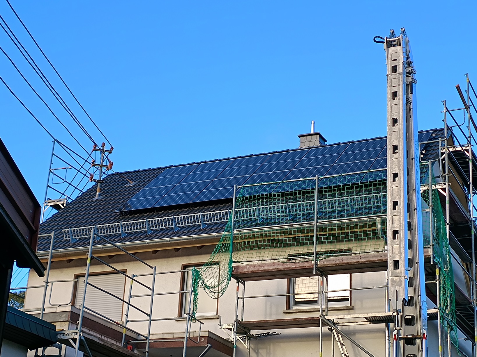 • Neben der Dämmung und Eindeckung war ebenfalls beauftragt eine Photovoltaik-Unterkonstruktion zu befestigen sowie bereitgestellte Module aufzulegen, zu verkabeln und die Kabel durch Dach und Dämmebene ins Gebäude einzuführen (quasi als Teilgewerk, da die Abnahme und Inbetriebnahme durch ein anderes Unternehmen erfolgt, unabhängig vom Dachdecker).