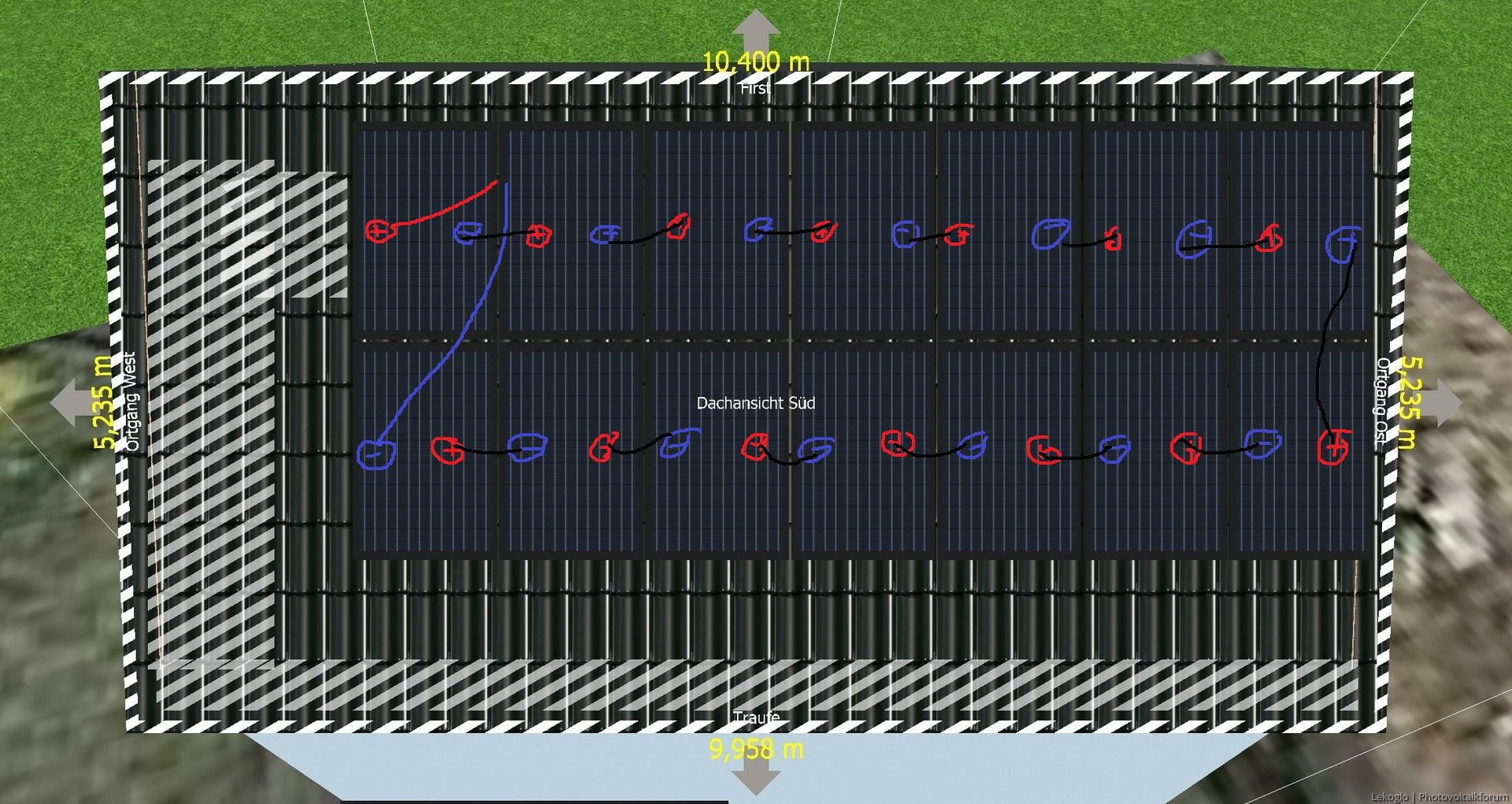 • Ich habe im Vorfeld auf den Wunsch einer leiterschleifenfreien Kabelverlegung der Module hingewiesen. Dieser wurde abgetan mit "das ist bei der Feldgröße irrelevant". Dementsprechend wurden die Kabel nun gemäß angehängter Skizze verkabelt und eine Leiterschleife erzeugt.