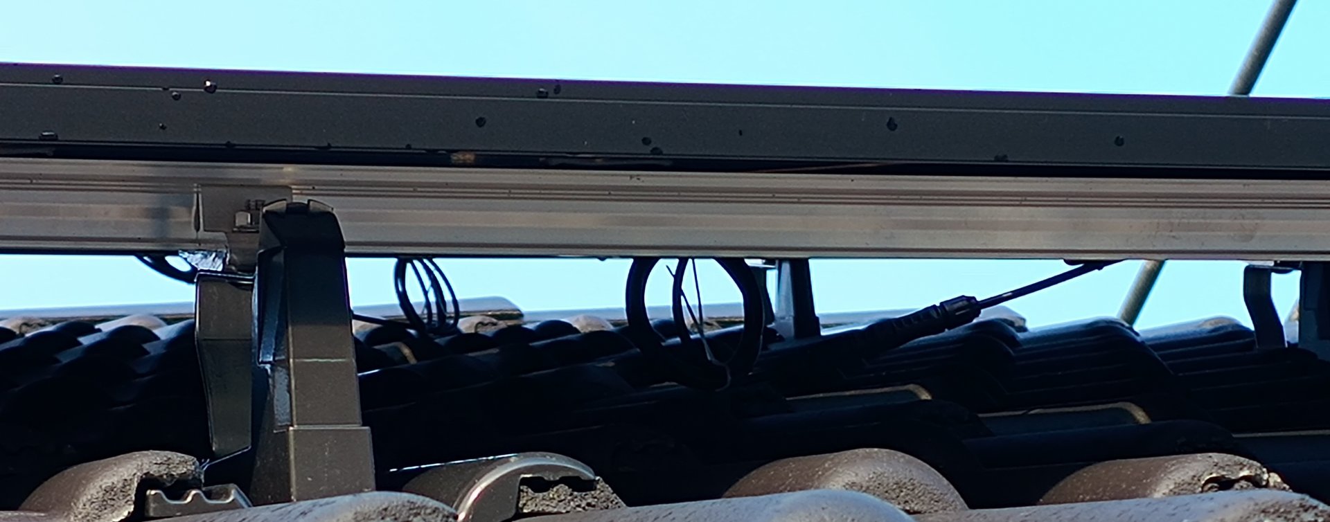 • Der Modulherstellerseitig angegebene Klemmbereich wurde um ca. 10cm unterschritten (=näher am Rand geklemmt). Das habe ich in dem Moment erkannt, als die Schienen montiert waren. Zu dem Zeitpunkt habe ich darauf hingewiesen, dass mit einem Versatz von 2 der 4 Schienen um 1 Ziegelreihe der vorgegebene Klemmabstand perfekt eingehalten würde - dies sei nicht nötig, das würde auch so einwandfrei halten.