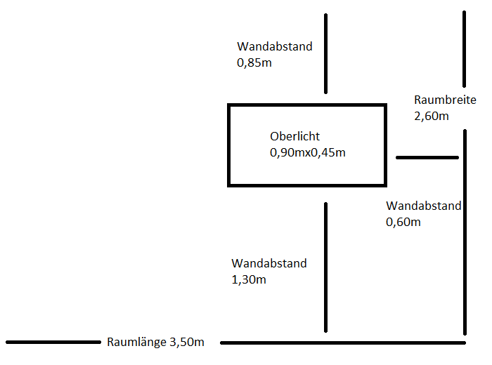 Nun habe ich gehört, dass man bei freitragenden Decken die Tragprofile grundsätzlich entlang der kürzeren Raumseite wählt. Das wäre in meinem Raum dann allerdings die 2,60m lange Seite. Bei der Variante würde die Länge des Oberlichts (0,90m) den maximalen Achsabstand der Tragprofile allerdings weit überschreiten.