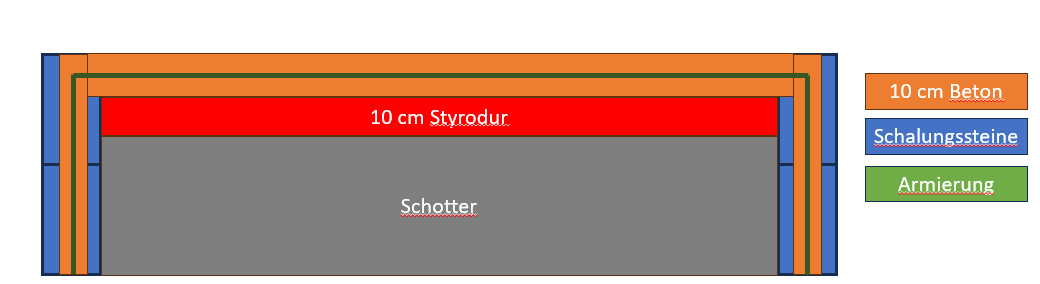 Da das Gelände nicht eben ist, will ich die "Schalung" mit Schalungssteinen in 2 Reihen ausführen. Den Aufbau habe ich mal grundsätzlich skizziert. Die Armierung soll durchgehend von Schalungssteinen zur Betonplatte ausgeführt werden. Ich würde gerne zwischen den Beton und den Schotter 10 cm Stryodur als Dämmung einbringen. Kann man das so machen?