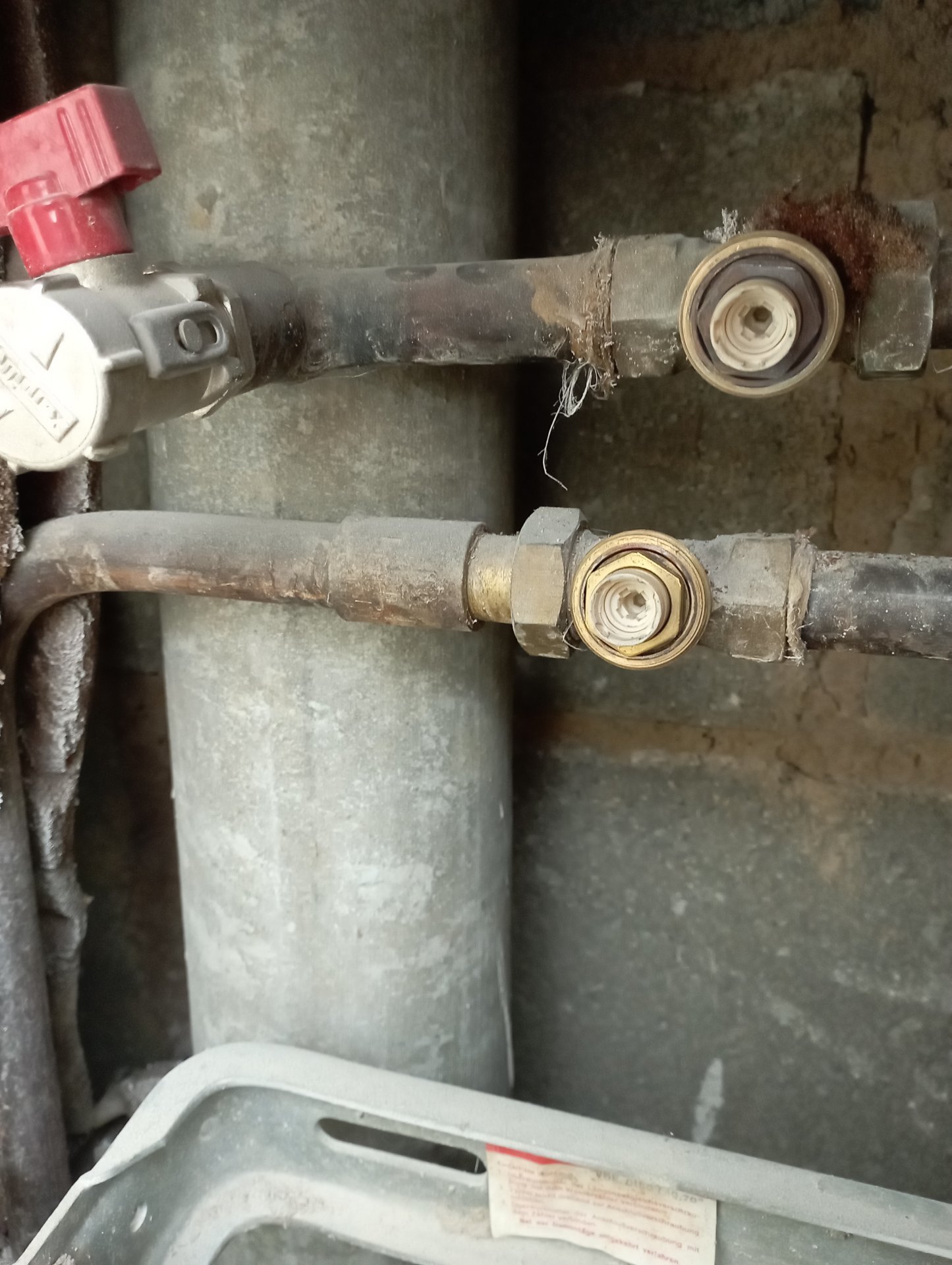 Sind das im bild mit bzw unter den beiden Messing Kappen nicht die Absperrungen für Vorlauf und Rücklauf der Heizung in der Wohnung ?