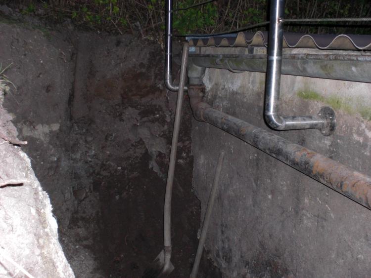 Im Grunde gehts mir gerade nur um das Hauseck und die garage. Die hängt hinten bis Dach komplett im Hang. Innen drückt das Wasser raus. Bin gerade am freigraben. Zu meiner Verwunderung ist sogar ein schwarzer Anstrich (Bitumen?) aufgebracht. Hauchdünn, mit vielen beschädigungenund nicht hoch genug. Nach 1,5m tiefe scheint er aufzuhören. Verfüllt ist mit sehr viel Sondermüll wie Flaschen Farbdosen Knochen, Batterien u.ä. Keine schöne Sache.