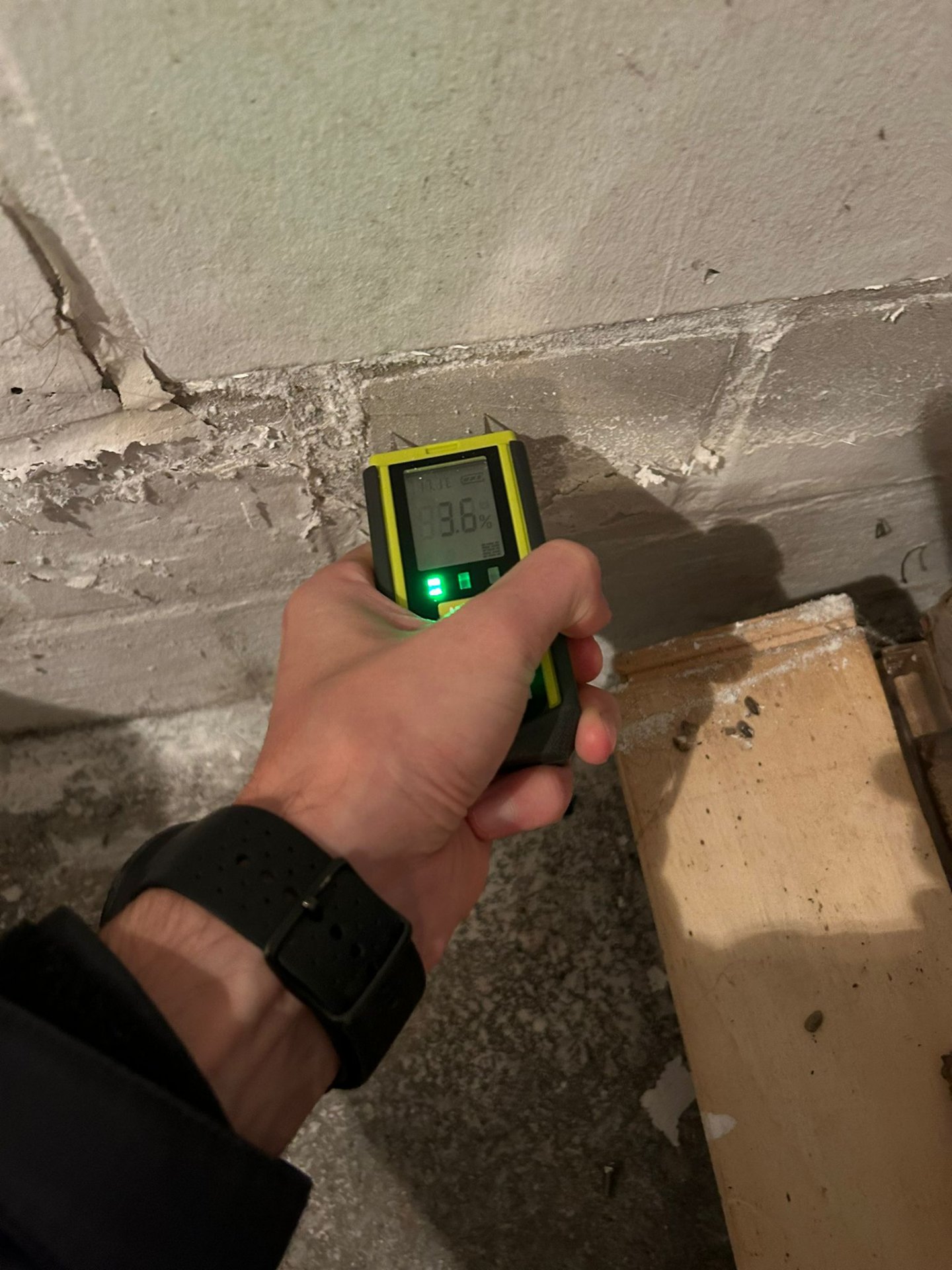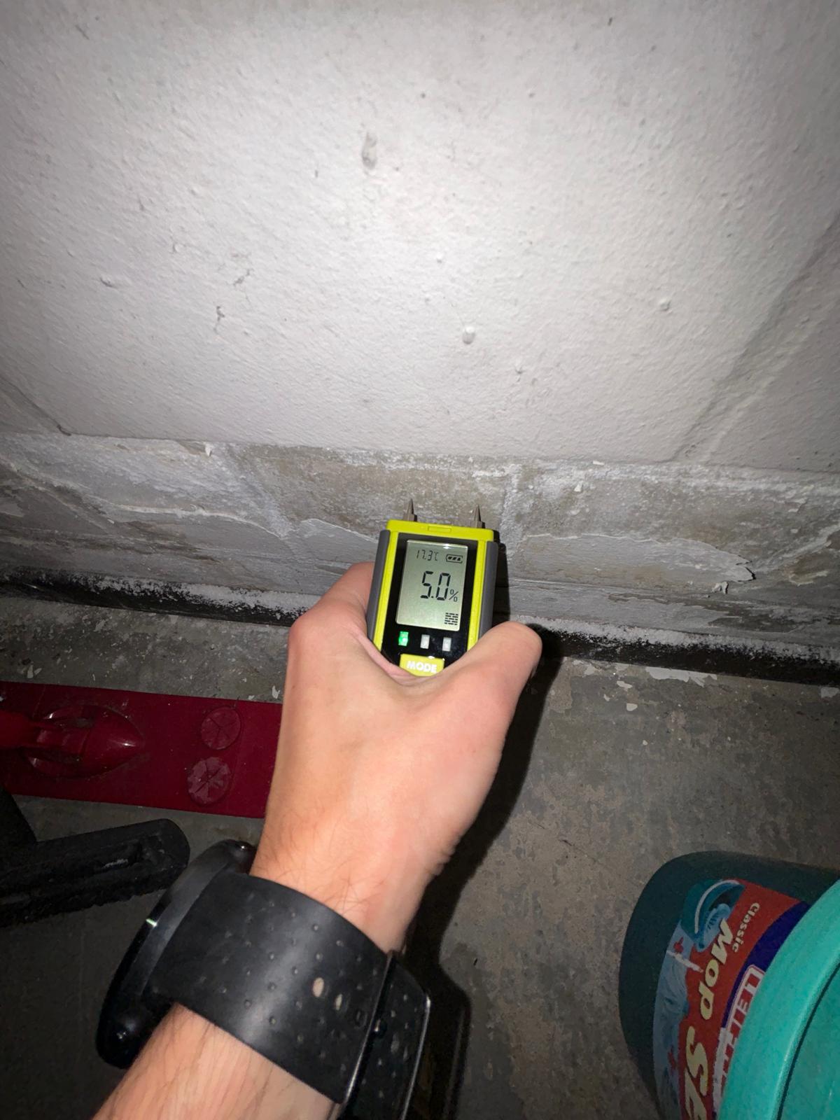 Ich habe die Feuchtigkeit in den Wänden mit einem Bauhaus-Feuchtigkeitsmessgerät gemessen. Trotz viel Recherche konnte ich nicht herausfinden, was die akzeptable Grenze für Kalksandsteinwände ist. Ich erhalte Werte zwischen 3 und 5 %, meist um die 3,5 %. Ich habe einige Fotos der Wände beigefügt. Alle Räume haben diese Schäden und es gibt einen beheizten Raum. Andere sind kalt. Ich habe nur an einer Stelle Schimmel gefunden (Bild). Die Luftfeuchtigkeit im Raum beträgt zum Zeitpunkt der Messung akzeptable 56%. Dem Zustand des Hauses über dem Keller zufolge vermute ich, dass sich die Vorbesitzer nicht so viele Gedanken um den Keller gemacht haben wie wir jetzt. Ich bin nicht sicher, wie lange die Wände schon so sind.