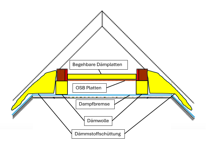 Deckenaufbau: Rigips, Folie (Dampfbremse oder -sperre weiß ich nicht), 5 cm Dämmung lückenhaft verlegt, OSB-Platten mit Nut/Feder als Boden, Abstand Folie zu OSB-Platten 23 cm.
