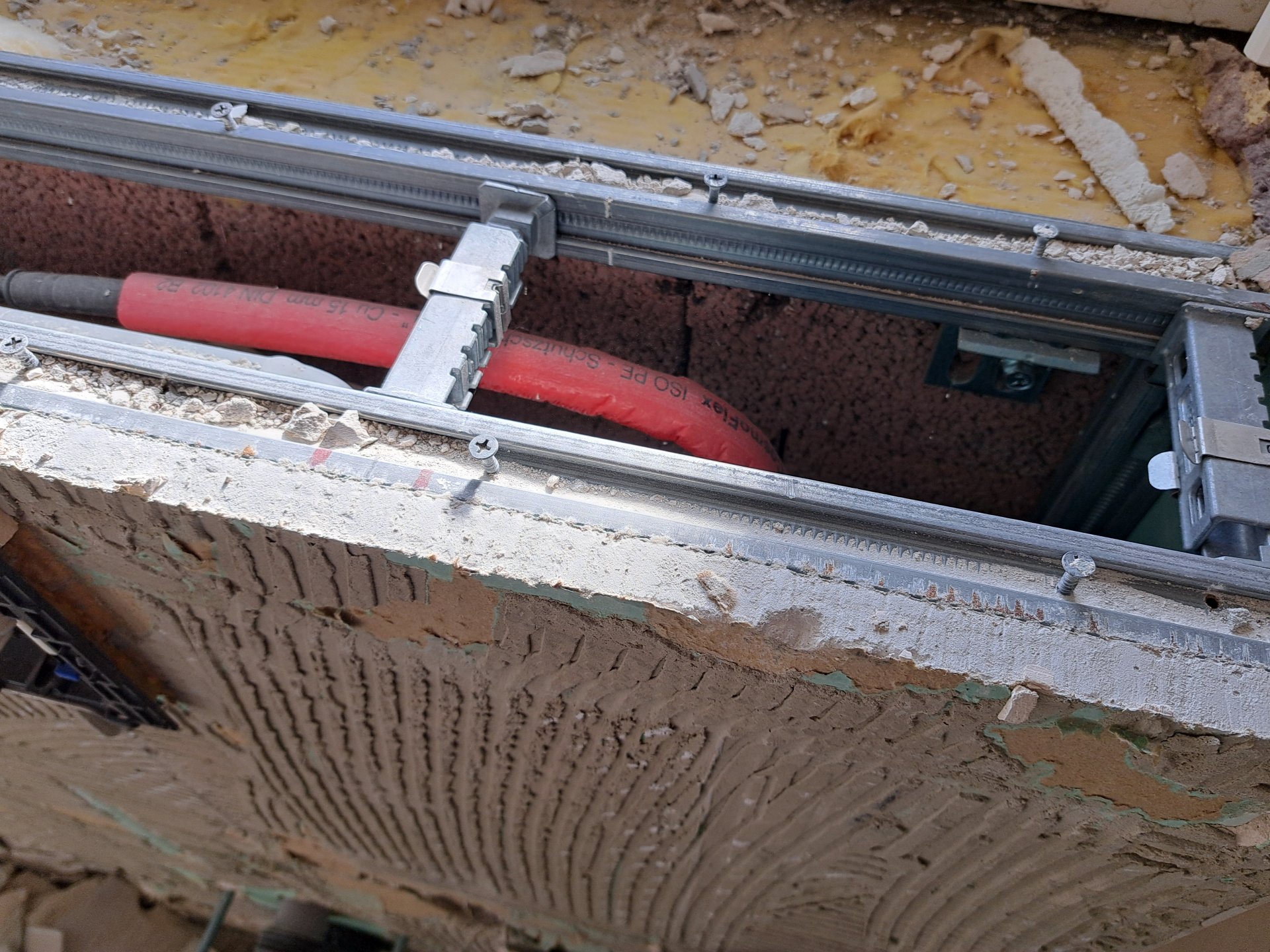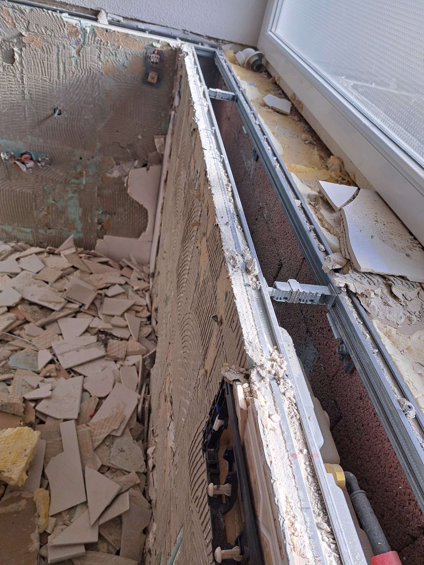 in unserem Badezimmer habe ich die alten Fliesen entfernt und die Vorwandkonstruktion muss erneuert werden. Obwohl ich Doppelbeplankung an der Stelle erwartet habe, handelt es sich nur (vermutlich) um eine Massivbauplatte (25 mm, siehe Fotos).