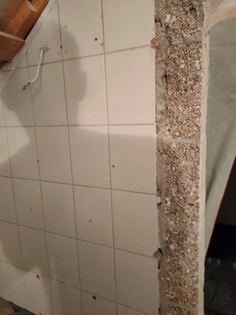 ich verlängere eine Mauerwand in den Raum, die Wand ist gefliest im dicken Mörtelbett. Soll also dran bleiben.