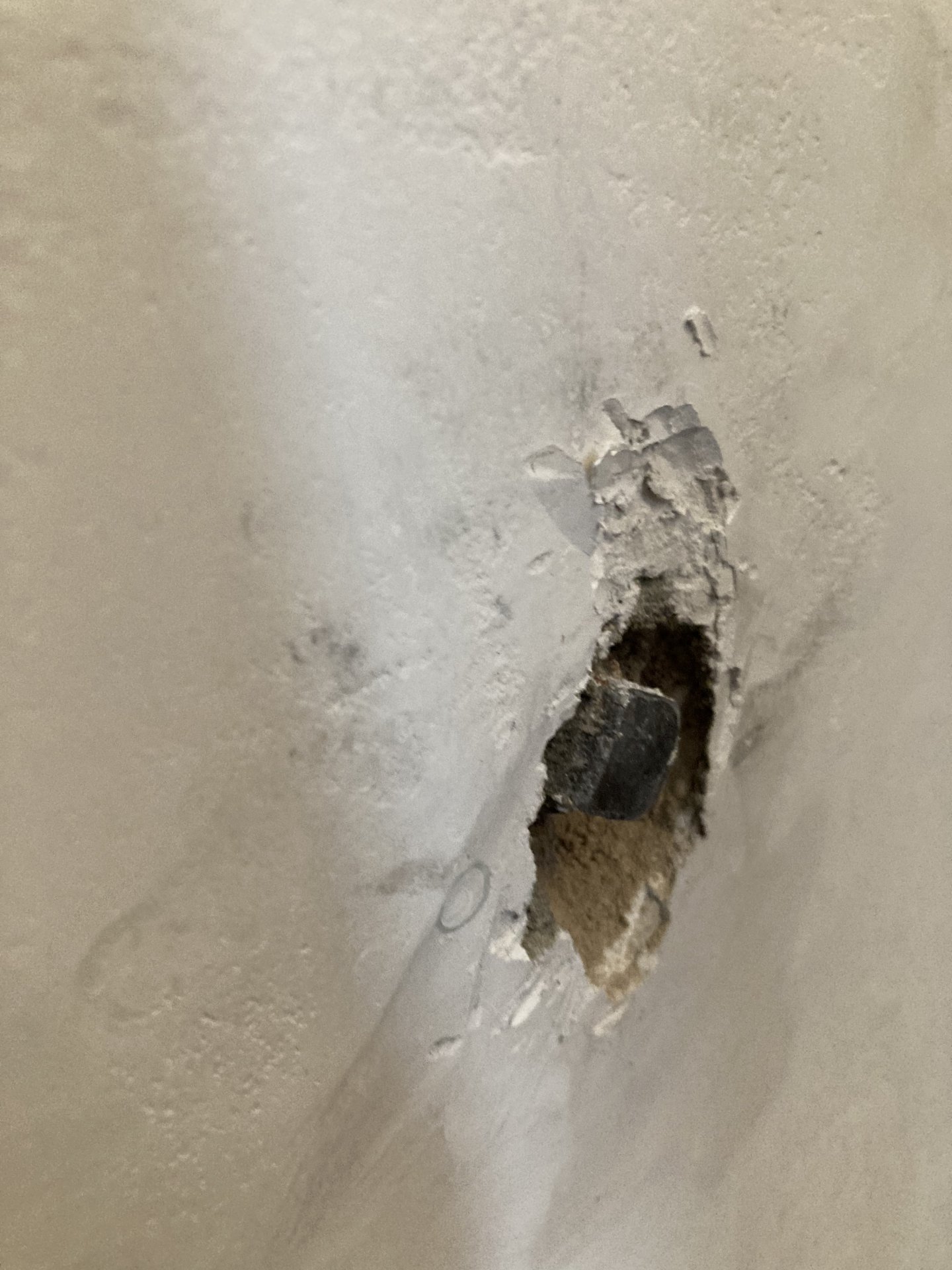Dieser riesisge Eisennagel schaut aus meiner Wand raus und wurde einfach überspachtelt. Ich habe versucht ihn abzuschleifen aber das hat nicht besonders gut funktioniert. Hat mir jemand einen Tipp wie ich eine glatte Wand bekomme?