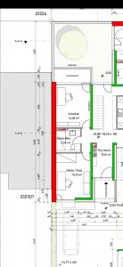 Von der hinteren Grenze gesehen soll der neue Bungalow 1m hinter unserem anfangen und 1,3 m vor unserem Haus herausragen ( siehe Abbildung).