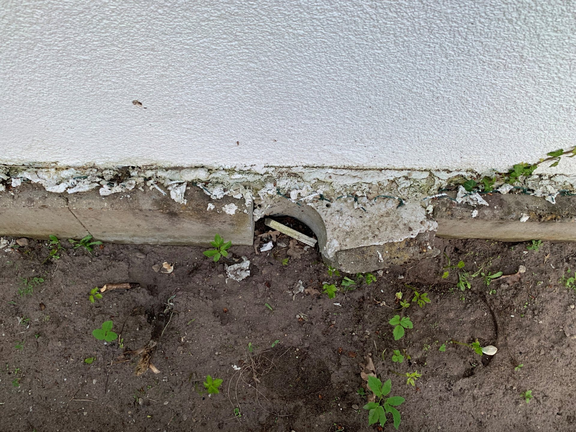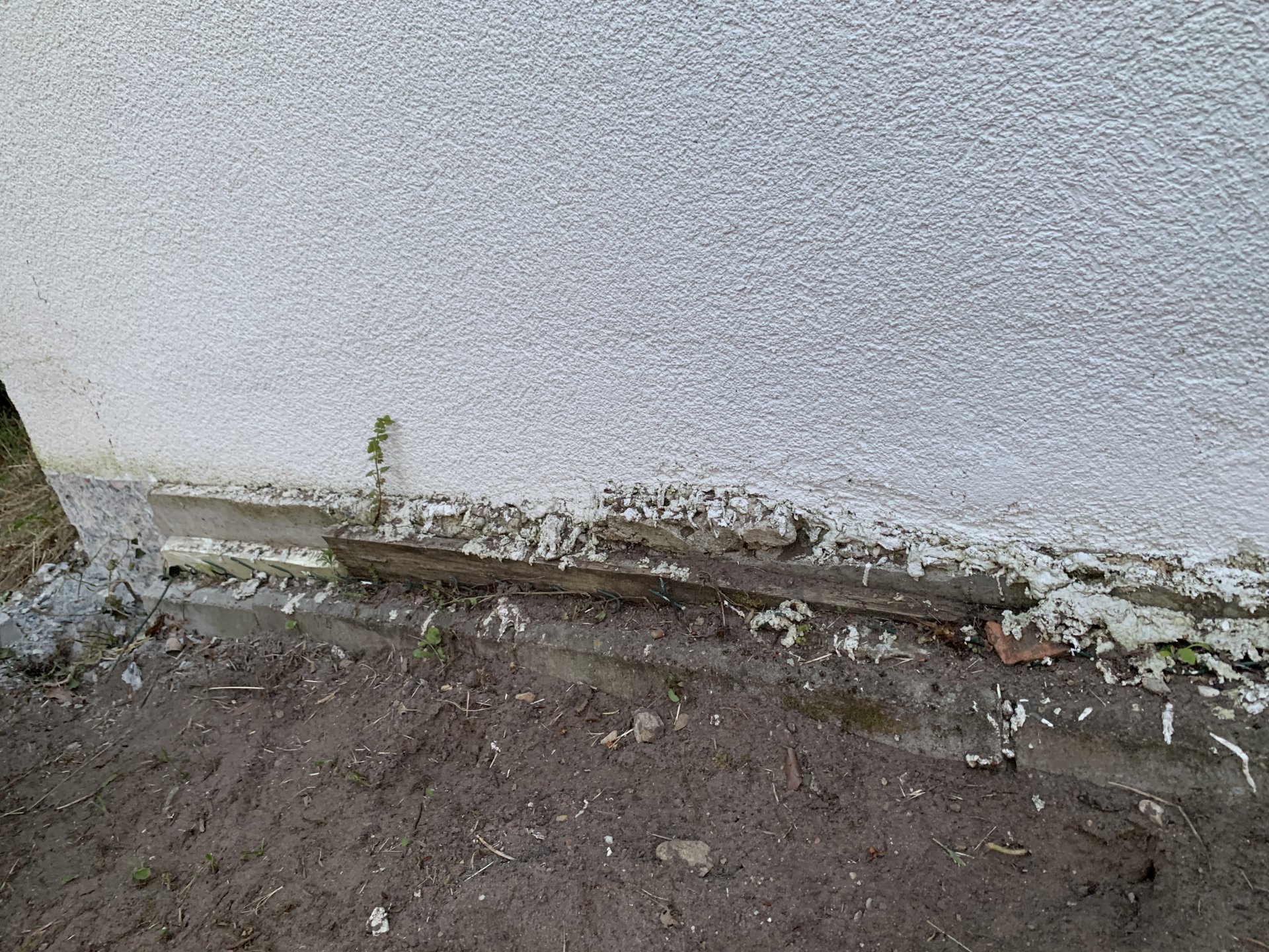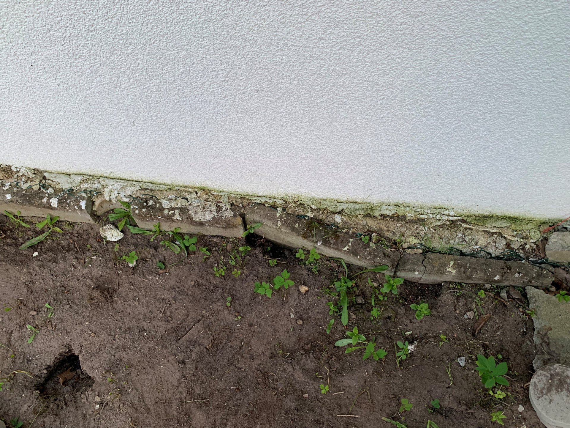 Da man die damals (Vorbesitzer meines Hauses) nicht auf mein Grundstück gelassen hat und die wohl nicht besonders gut schalen konnten, ist die Schalung (sofern vorhanden) an diversen stellen abgehauen. An anderen Stellen hat man sich die Schalung vollständig gespart und einfach an meine Rasenborde betoniert und dabei sowohl den Zaun, wie auch ein paar Zaunpfosten betoniert. Da man hier nun diese praktische Kante hatte, hat man sich beim Verputzen der Steine auch gleich gedacht, dass man den runterfallenden Putz da mal liegen lassen kann. Es sieht also einfach von vorne bis hinten bescheiden aus...