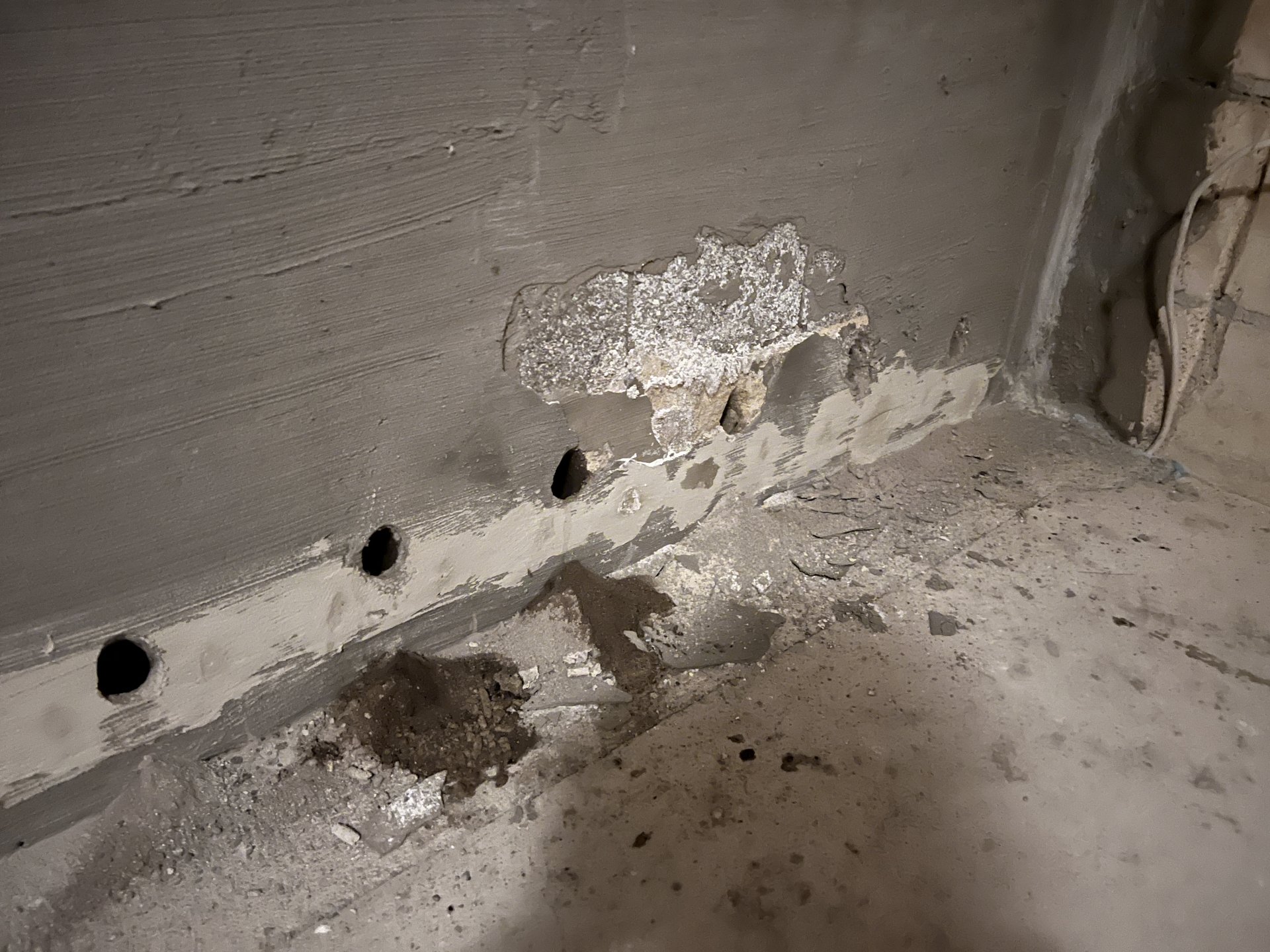 Das ursprüngliche Angebot war für eine Horizontalsperre per Druckinjektion. Da es aber einen Mangel gegeben hat (siehe Salzausblühungen im ersten Bild), haben wir ihn jetzt zum Nachbessern bestellt. Er sagte er bessert nach, hat aber vorab nicht genau gesagt, was er macht. Das Resultat waren die großen Bohrlöcher. Das Material, das er für die großen Löcher benutzt hat, war wohl von der Firma WEBAC. Die genaue Bezeichnung schickt er mit noch zu.
