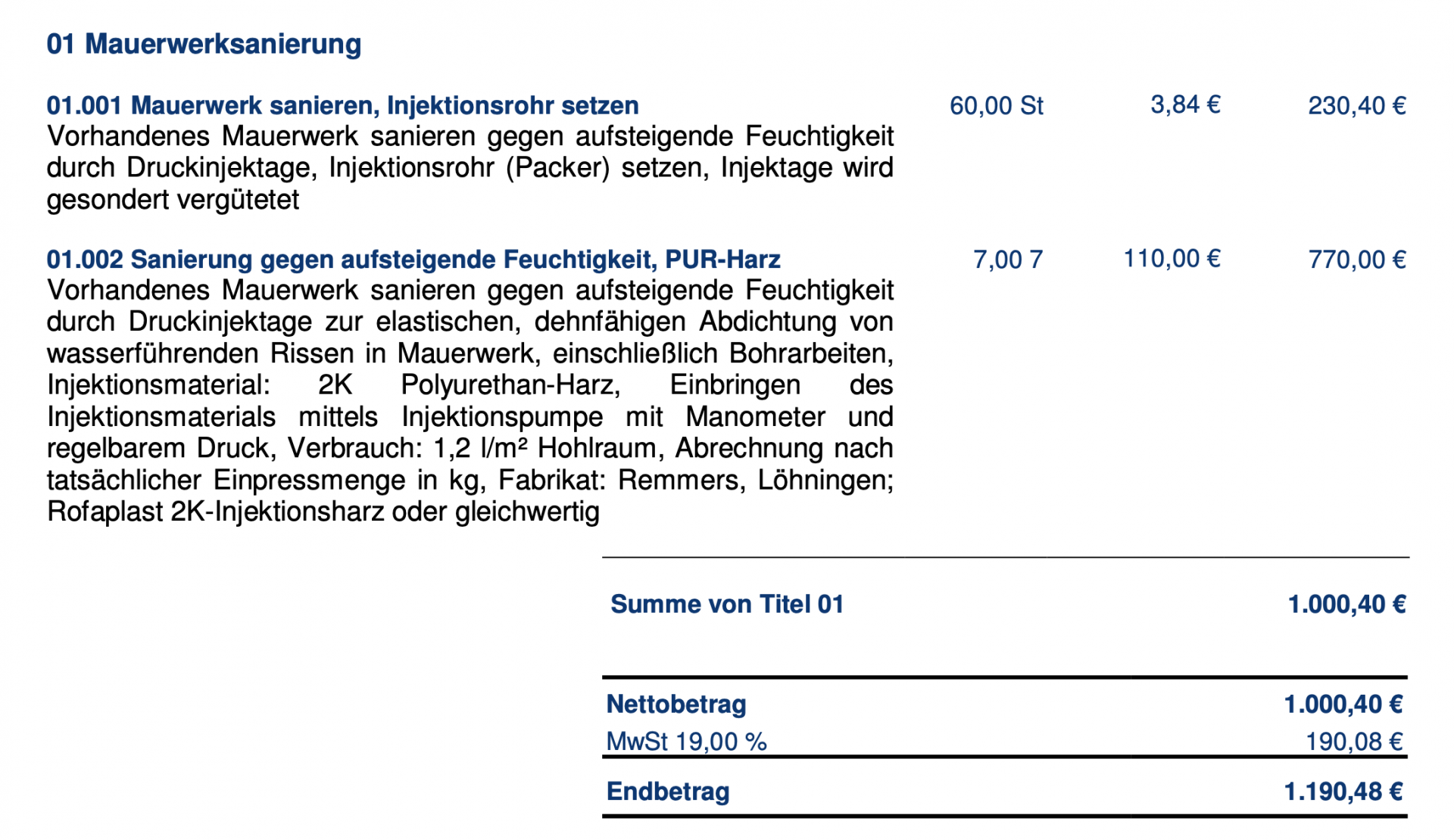 Das ursprüngliche Angebot war dieses hier. Wie gesagt: Was er jetzt beim 2. mal gemacht hat, hat er nicht vorab geschildert, hat aber scheinbar ohne Druck das Material von WEBAC in die großen Bohrlöcher einsickern lassen und möchte sie mit "Spezialbeton" zumachen.