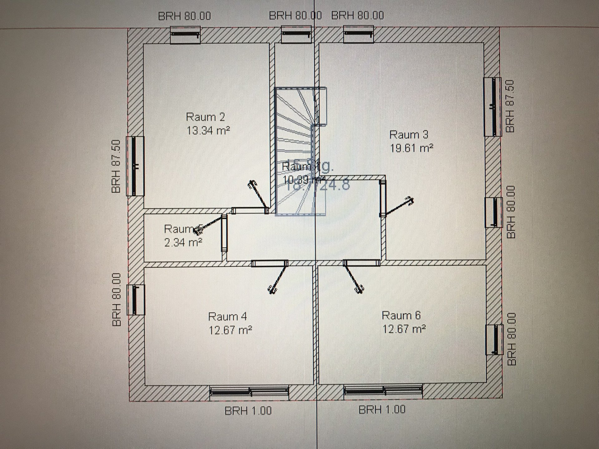 Raum 2 scheint mir etwas zu schmal zu sein, um dort den Schrank (315 cm) an die Wand zu Raum 4 zu stellen? Demnach müsste das Treppenhaus weiter nach planlinks und die linken Räume würden auch schmaler.