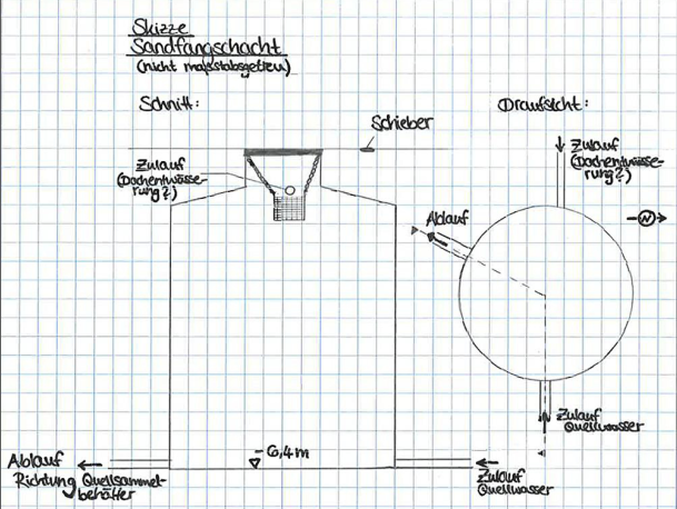 Aus dem Sandfang geht es dann in der Sammelbehälter und von da aus in einen unterirdischen Bach. Früher (18xx) war das Teil einer Pumpstation.
