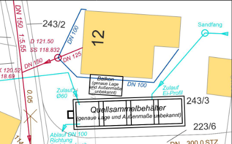 Der Zulauf (min. 6,4m tief), der im Sandfang mündet, trägt eine Wasserquelle die sich aus Regenwasser speist und vom Berg über dem Grundstück kommt.