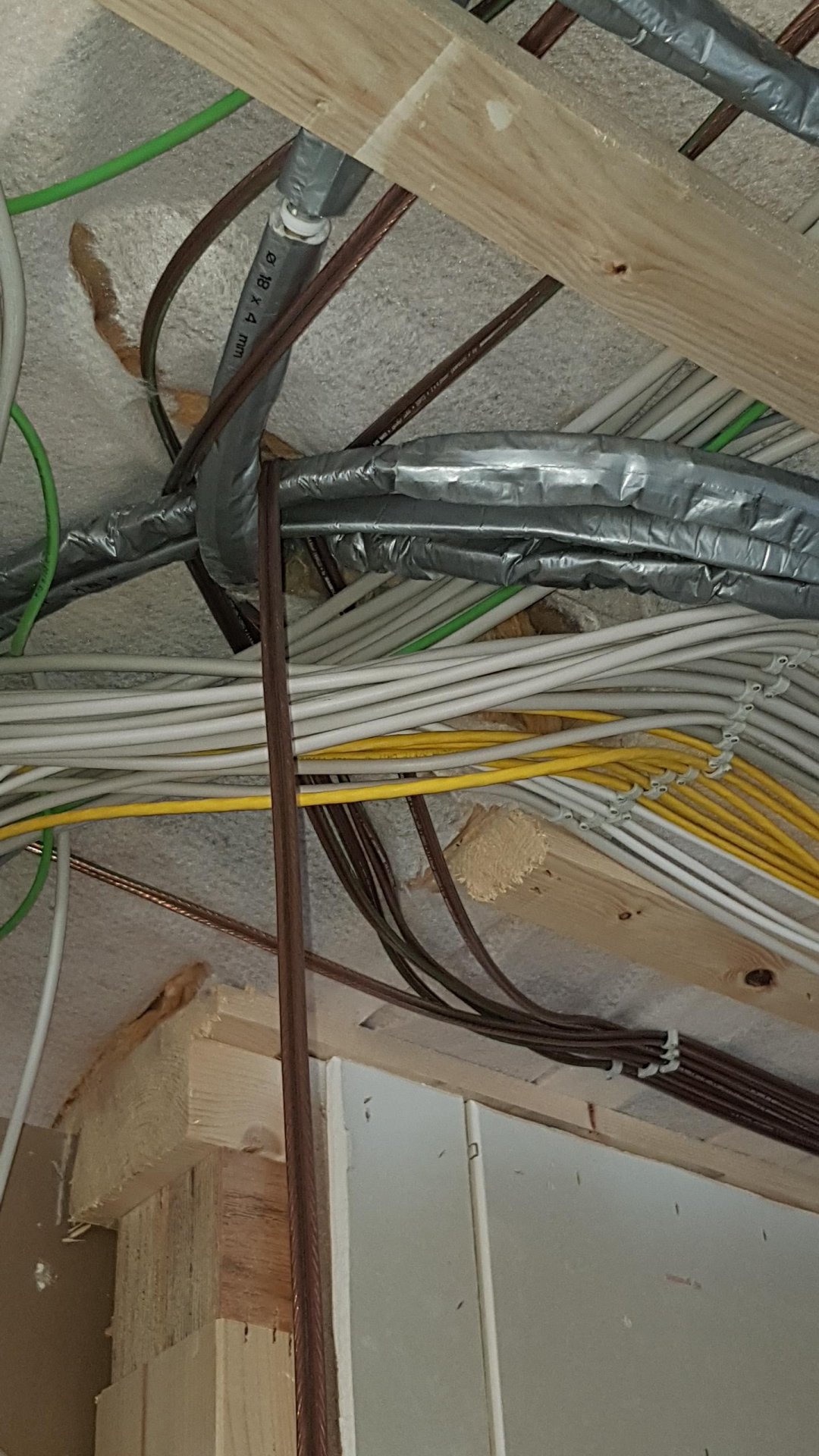 nächste Woche werden die Wände unseres Fertighauses verschlossen und verspachtelt. Es wurden entliche Strom (NYM), LAN (Kat7 S/FTP), Sat-Kabel und ein Bus-System verlegt. Zusätzlich wurden HDMI und Lautsprecherkabel verlegt.