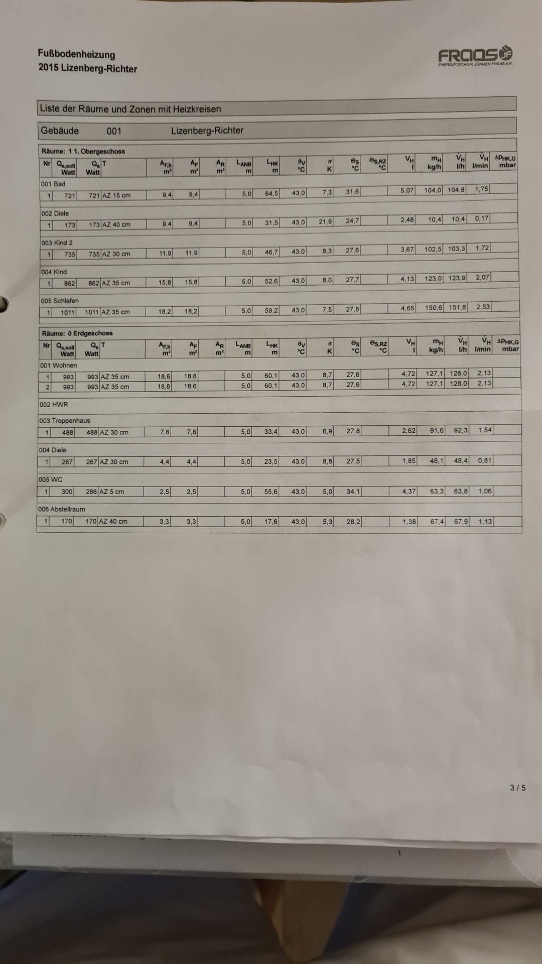 Auf dem Bild das ich geschickt habe bevor ich die Bilder mit den heizschlangen gesendet habe, kann man die verlegeabstände, heizkreislängen, Temperaturen, und auch die durchflussmegen sehen. Und genau so is das auch eingestellt. Weil es ja laut meinem heizingsbauer so sein muss. Und ich es ja erstmal so belassen muss weil ich ja bereits einen Anwalt eingeschaltet habe.