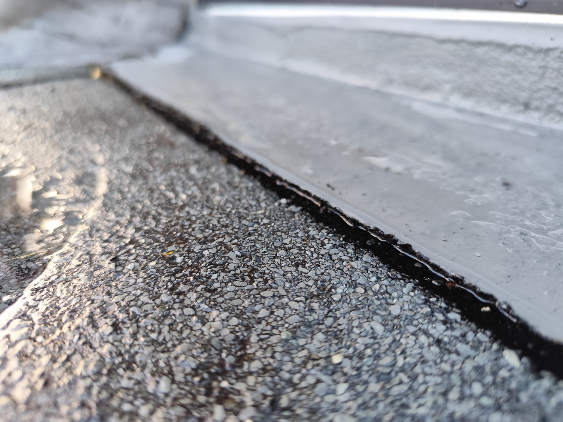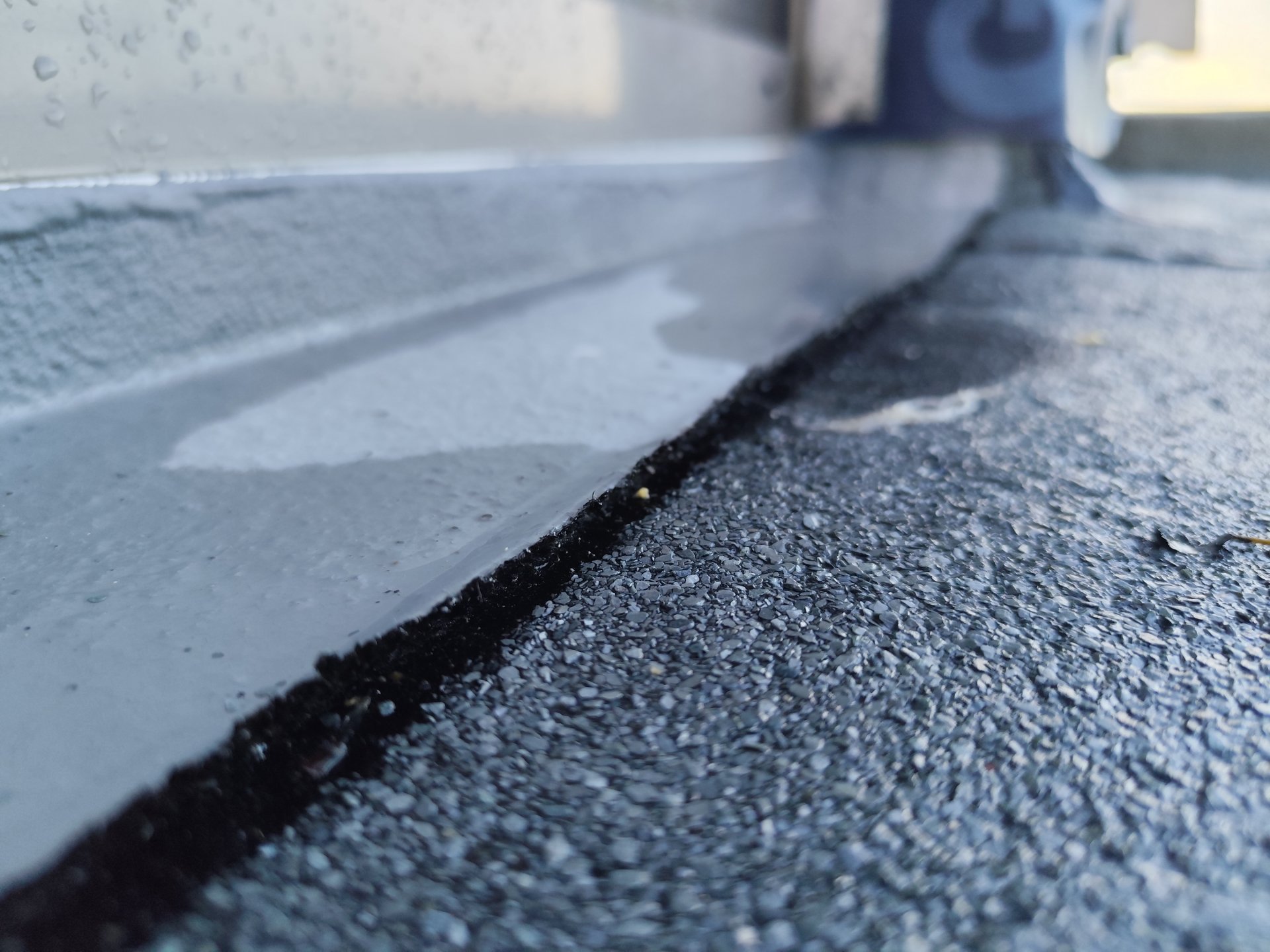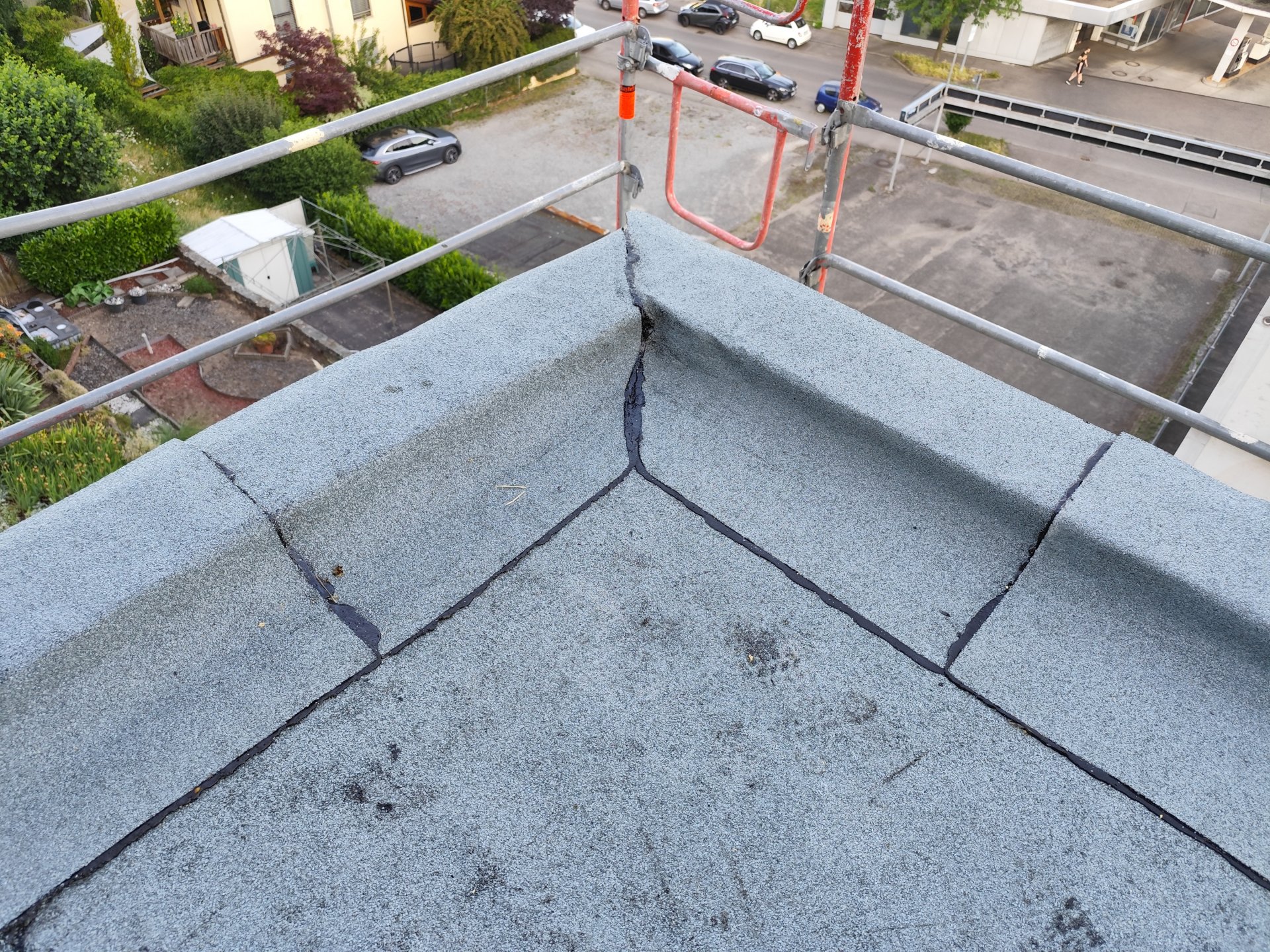 Sicher, dass sich der Flüssigkunststoff da ablöst? Das sieht so aus, als ob er genau an der Kante der Schweißbahn endet und daher der Höhenversatz entsteht.