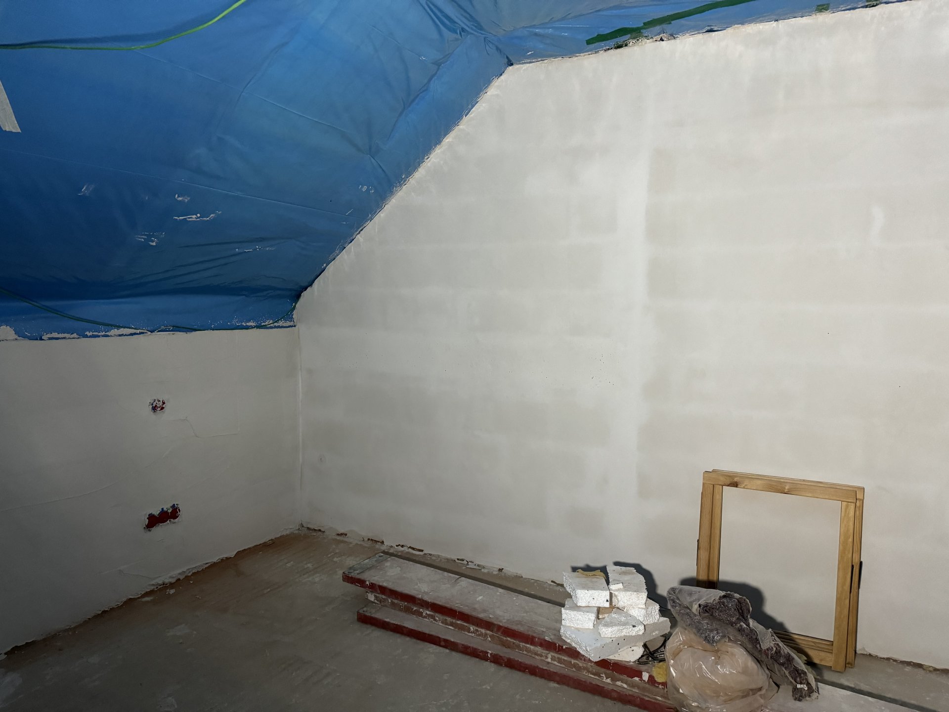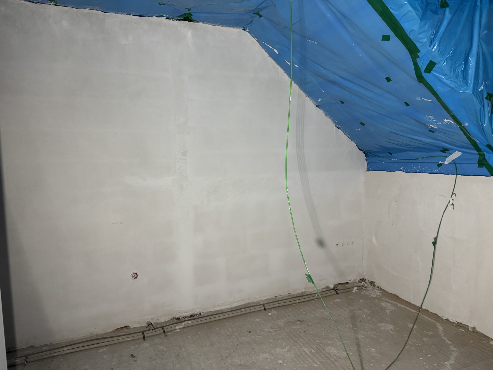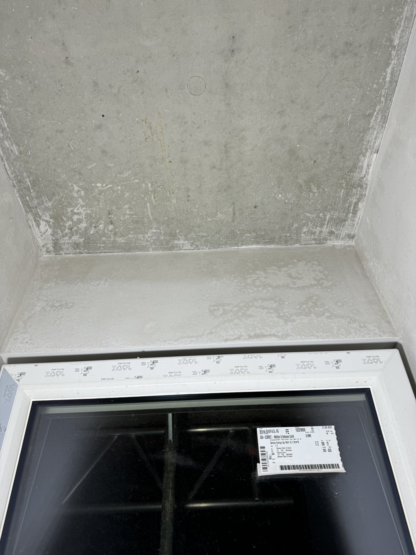Der Schimmel ist also nun direkt entlang des Ringankers (Schalung+Beton) zu sehen und das in dem Zimmer, welches selbst noch kein Fenster hat. Dort fehlen leider noch die Dachfflächenfenster.