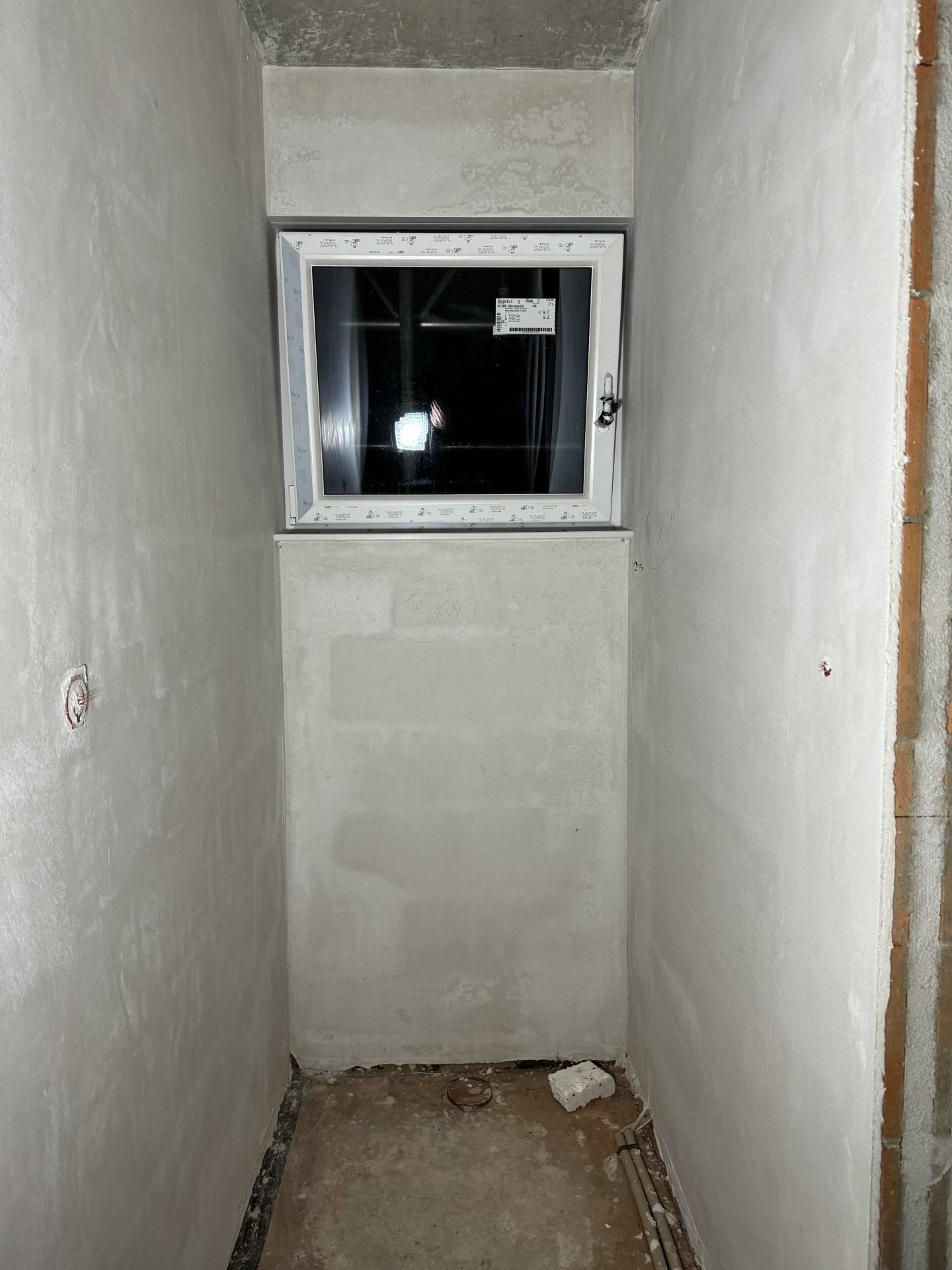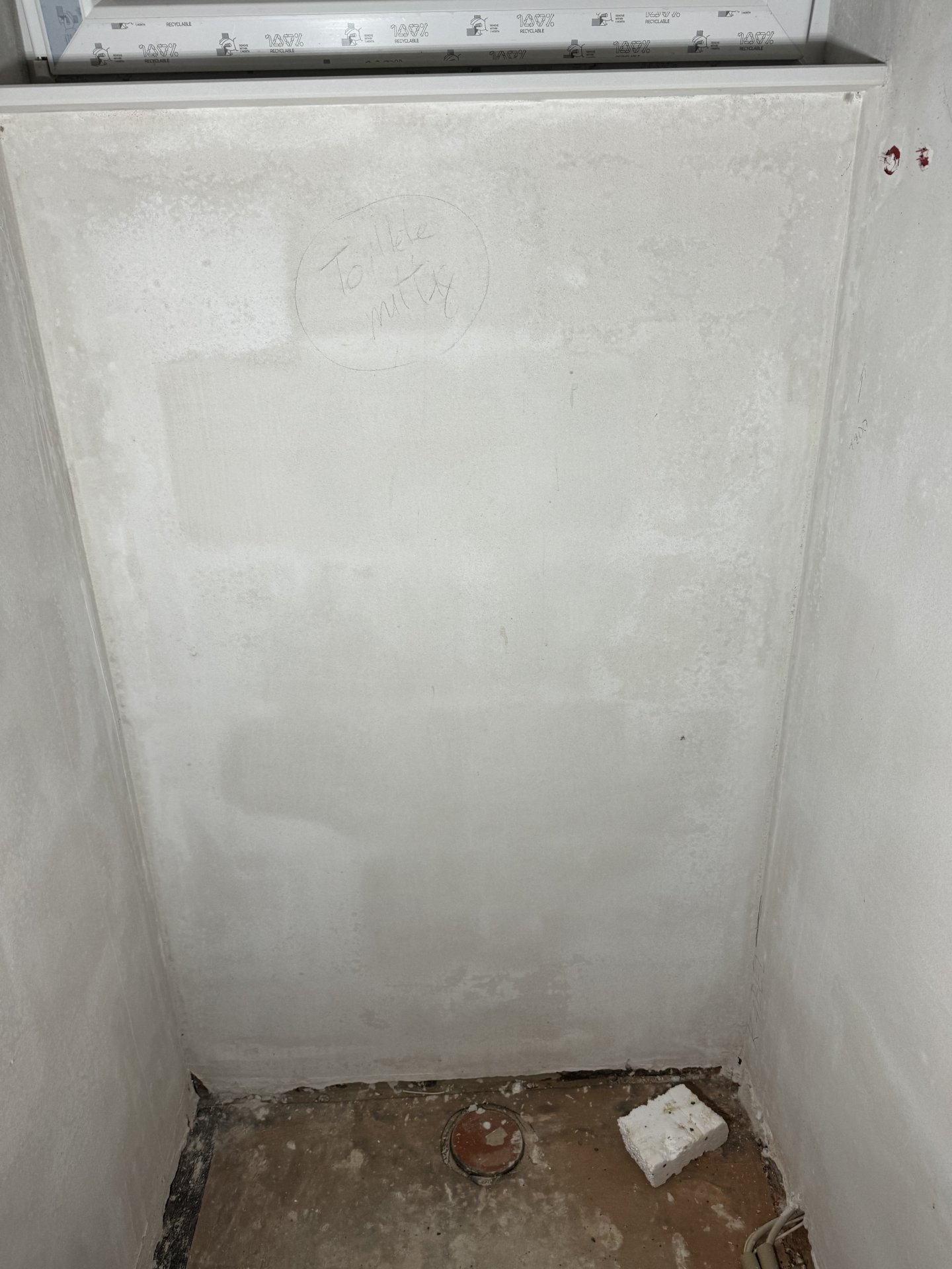 Nun habe ich noch eine fragliche Stelle im EG Bad gefunden. In den Bädern wurde ein Zementputz bzw. ein Putz mit erhöhtem Zementgehalt verwendet. Die Fenster sind auf Dauerkipp, nur zur Info.