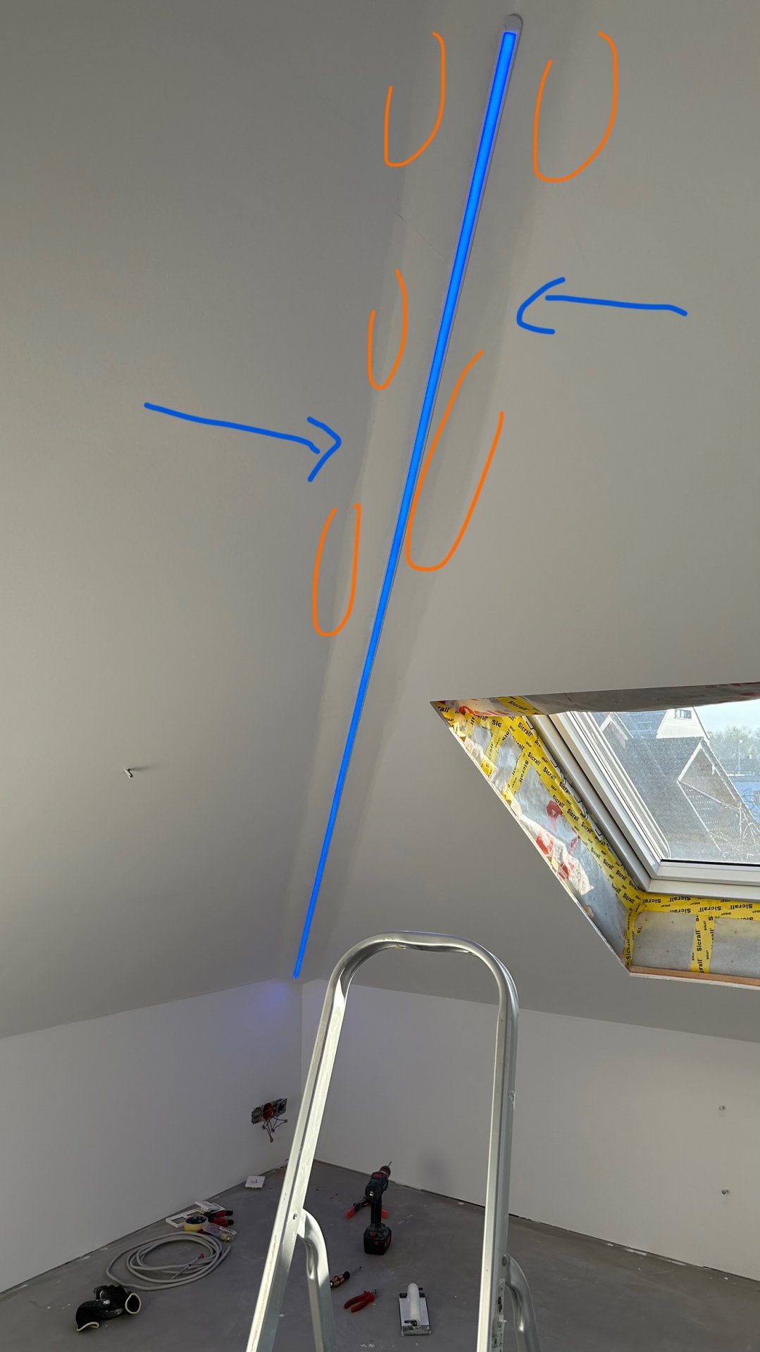 Nochmal zur "Rundung". Im Anhang hab ich mit blauen Pfeilen die "Rundung" nochmal hervorgehoben. Die Dachschräge von rechts und von links treffen an diesen Punkten mit den Pfeilen also fließender Übergang "Rundung" auf die gerade Gipskartonfläche wo auch der LED Streifen drin ist.