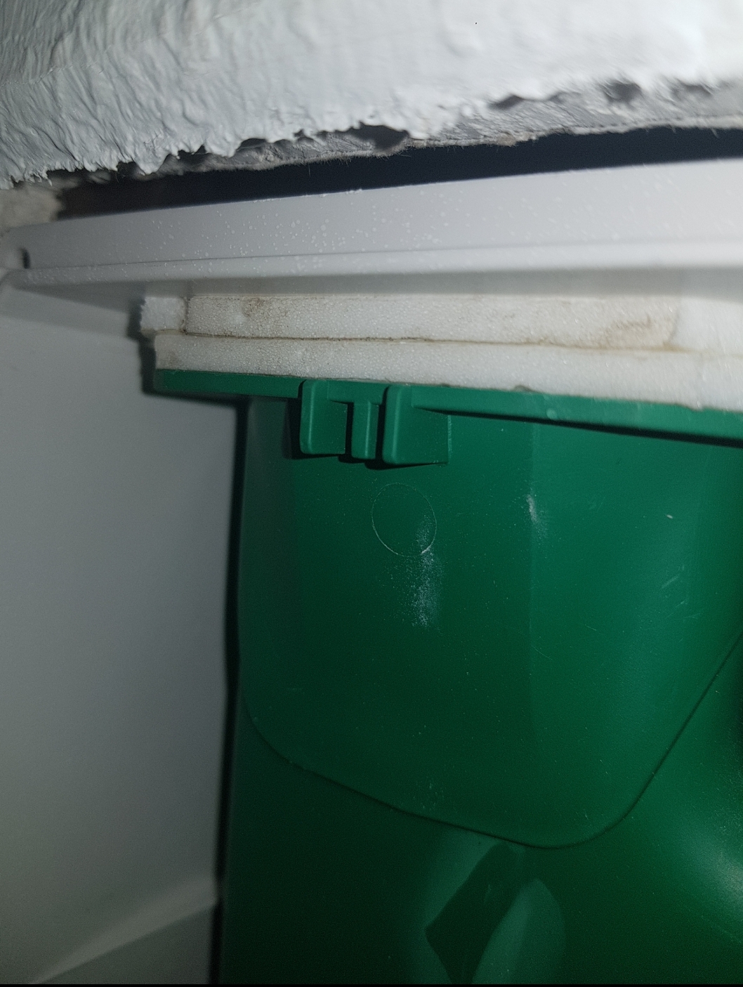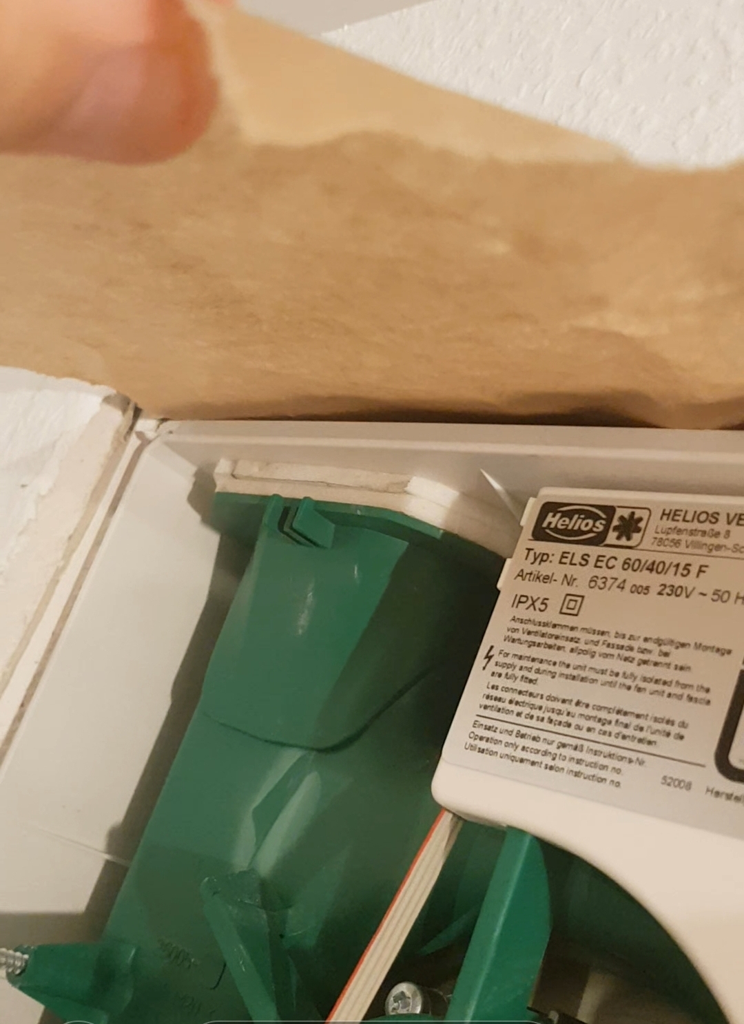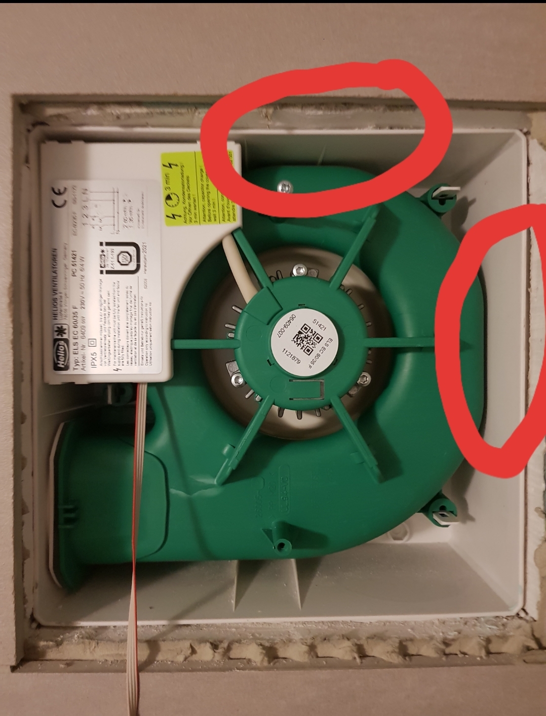(Kleiner Funfact: habe hier die Abdeckung am Wochenende mal abgenommen. Dieser Lüfter sitzt so mit seinem Gehäuse in der Wamd dass ich dies einfach hin und her bewegen kann, ergo sitzt er schräg und hier kann ich außerhalb des Gehäuses wo der Ausöass des Lüfters sein müsste, eine Kartonplatte entlang schieben. Wenn ich das richtig sehe sozusagen zwischen Luftauskass und Rohr. Ich nehme an das sollte so auch nicht sein aber das ist Story 2).