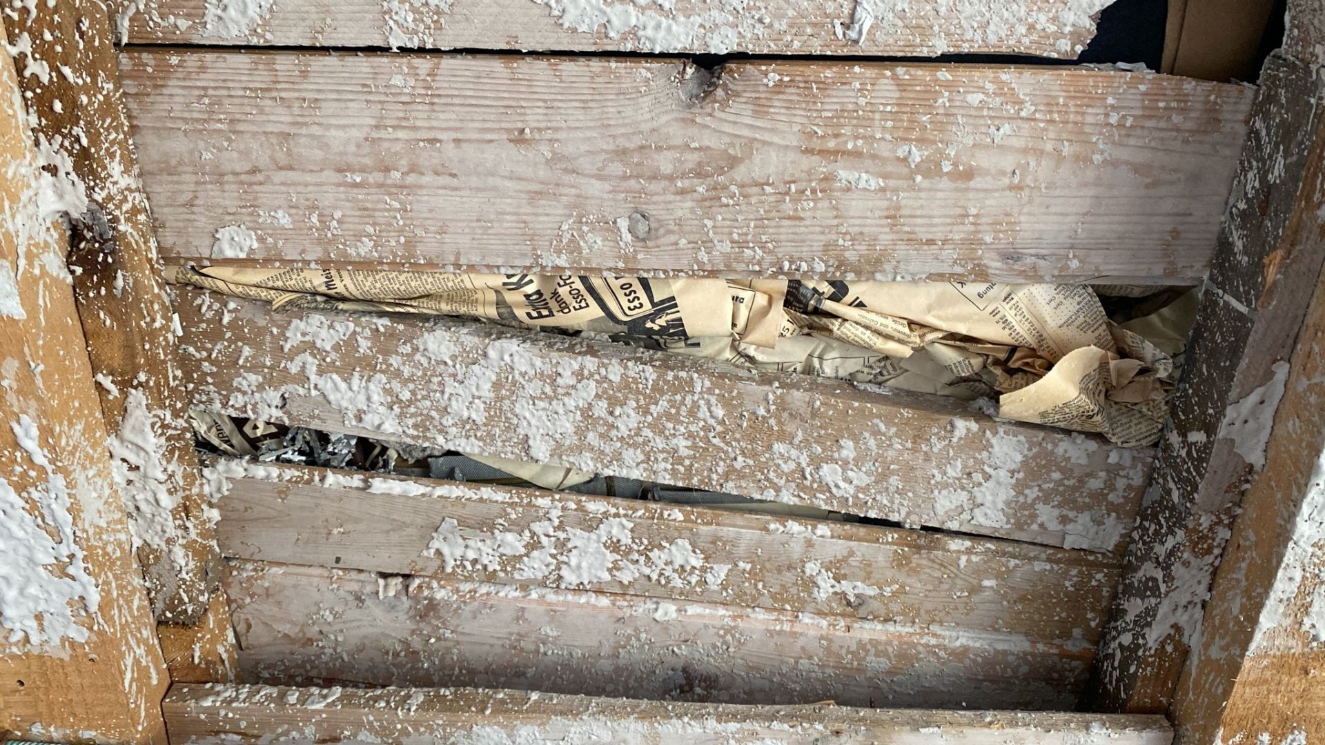 Zwischen dem letzten Balken und der Mauer ist ein Spalt von ca 6-8 cm Breite, darin findet sich allerhand Kram: Heraklit-Reste, Zeitungen, Illustrierte, Pappe, aufgerollte Zementsäcke. Ich würde diesen Spalt einfach leer machen und mit Steinwolle auffüllen?